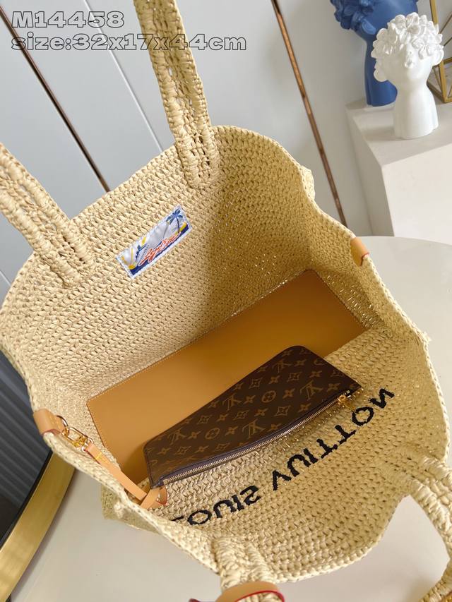 / 出厂价P 顶级原单 M14458 本款 Shopper Tote 手袋以淡雅拉菲草洋溢夏日气息,巧妙映衬正面路易威登标识刺绣。可拆卸做旧皮革名牌增添复古韵味,内