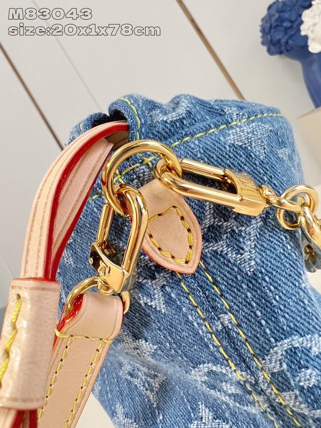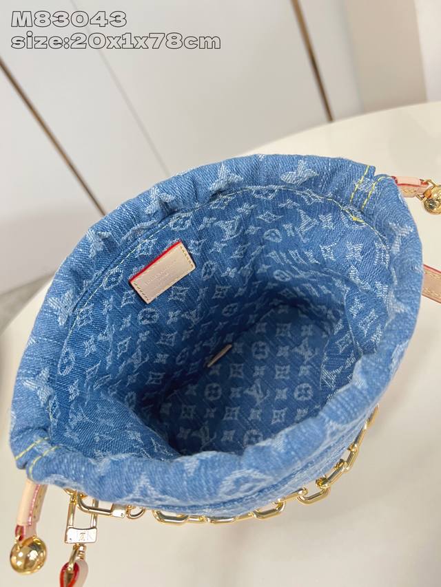 出厂价P 顶级原单 M83043 這款Nano Noé背包於今季煥然一新,用上現代風格的Denim藍色,與對比鮮明的皮革飾邊互相襯托。背包採用有機棉質面料製作,飾有標誌性的Monogram圖案,並搭配金色鏈帶。抽繩設計飾以Lv鐫刻吊飾,散發玩味,並向品牌傳統致敬。20.5 X 17.5 X 8.8 厘米 長度 X 高度 X 闊度