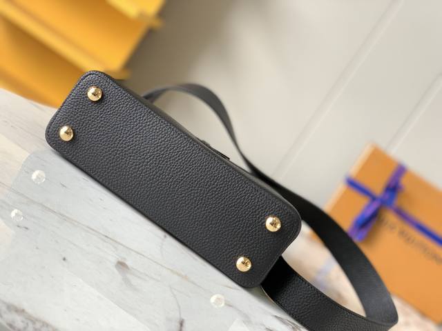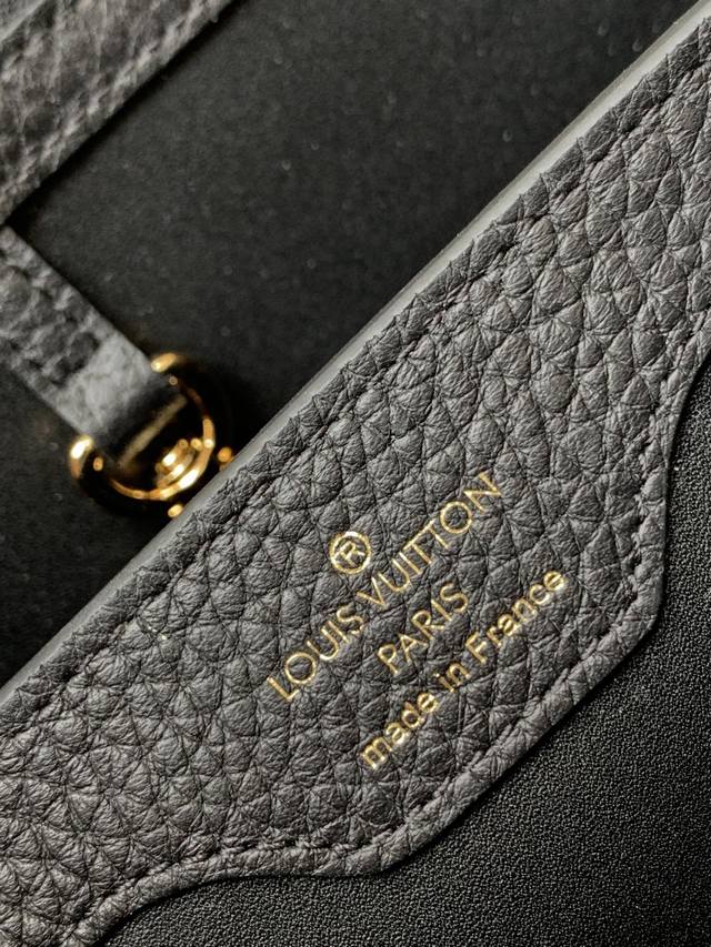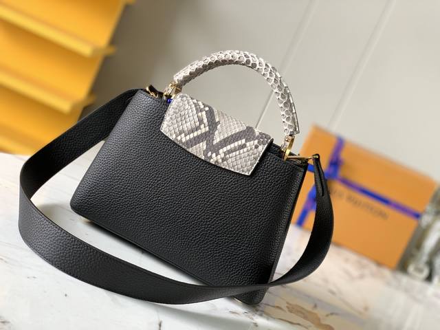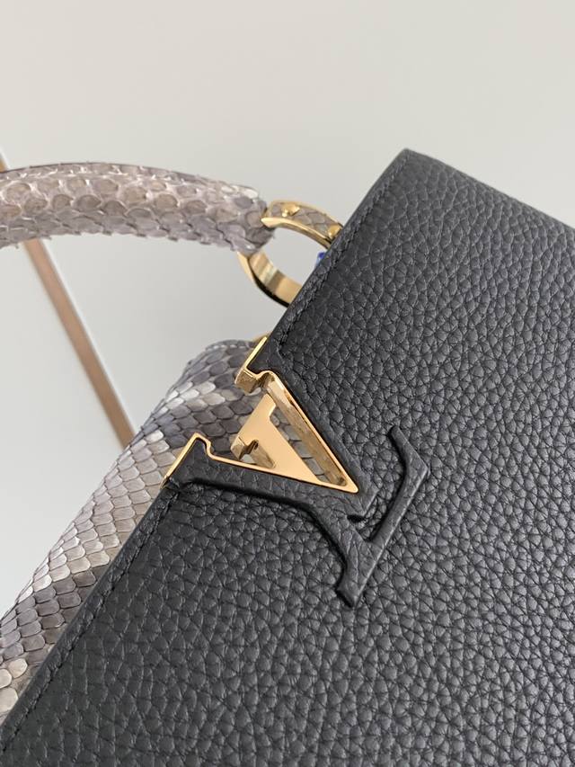 迷你号 此款Capucines 手袋臻选蟒蛇皮来点缀隽永的黑色 Taurillon 皮革。异域风情的蟒蛇花纹包裹 Lv 字母标识一角,手柄以圆环固定,镶缀金色饰钉。 进口荔枝纹牛皮配纯胎牛皮内里