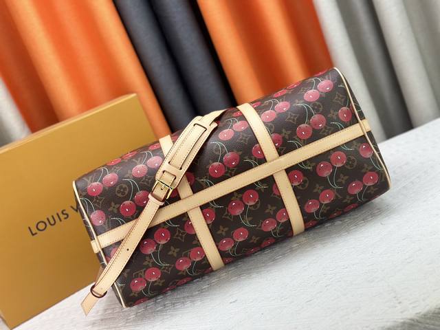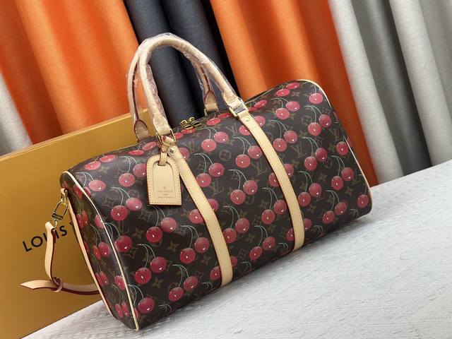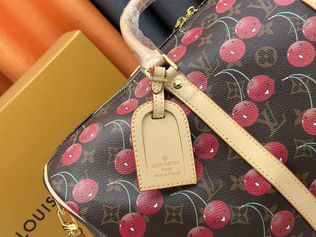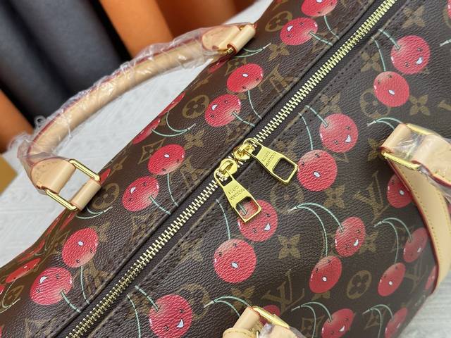 M13764 M41416 Keepall BandoulièRe 45 旅行袋借路易威登 X 村上隆复刻系列再焕新颜。经典 Monogram 帆布呈现错落有致的甜美樱桃图案,搭配醒目内衬,道出知名日本艺术家村上隆的玩趣美学。侧带、顶部手柄和可调节肩带流露皮革的自然色泽,耀目金属件完善整体。