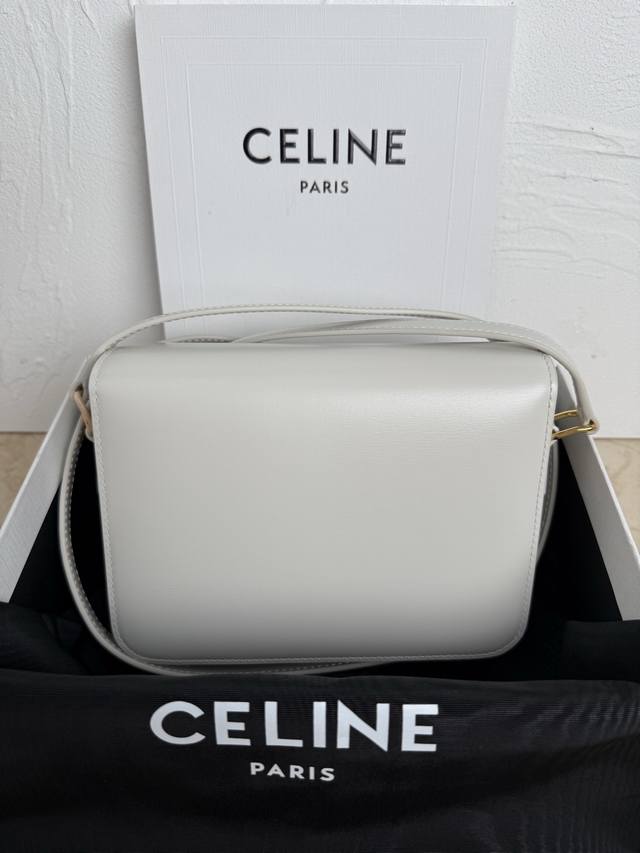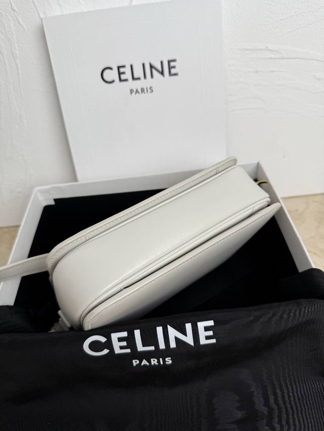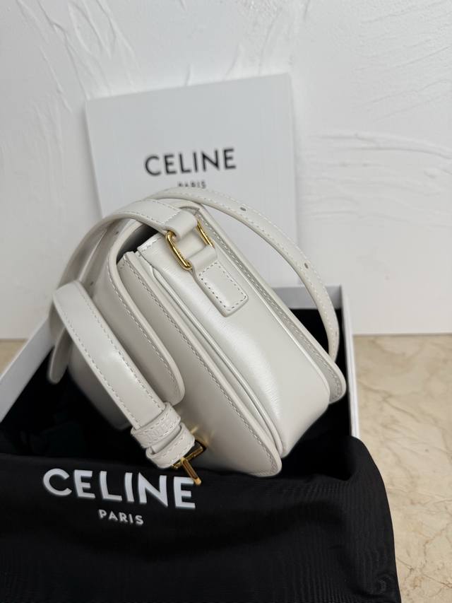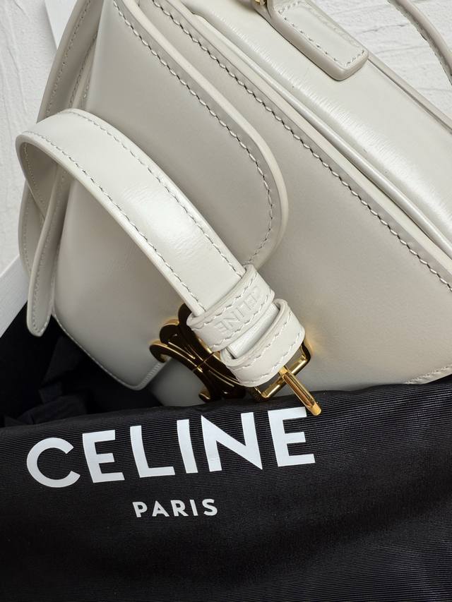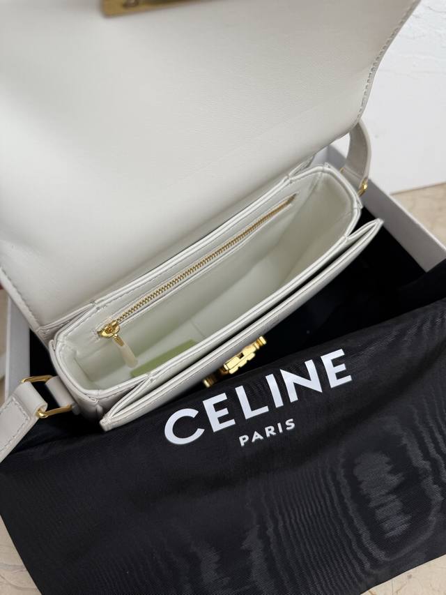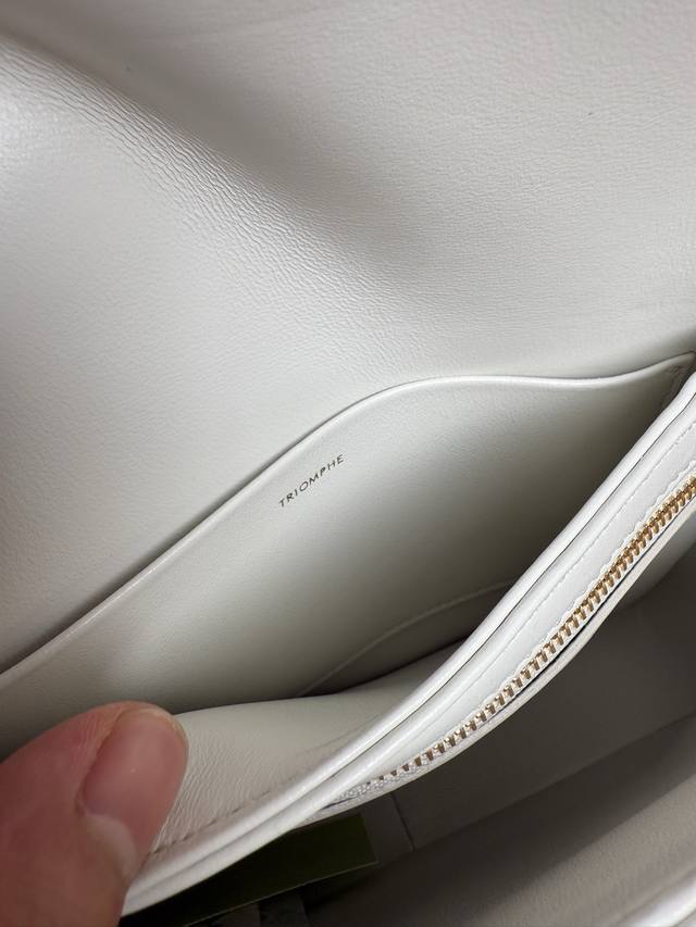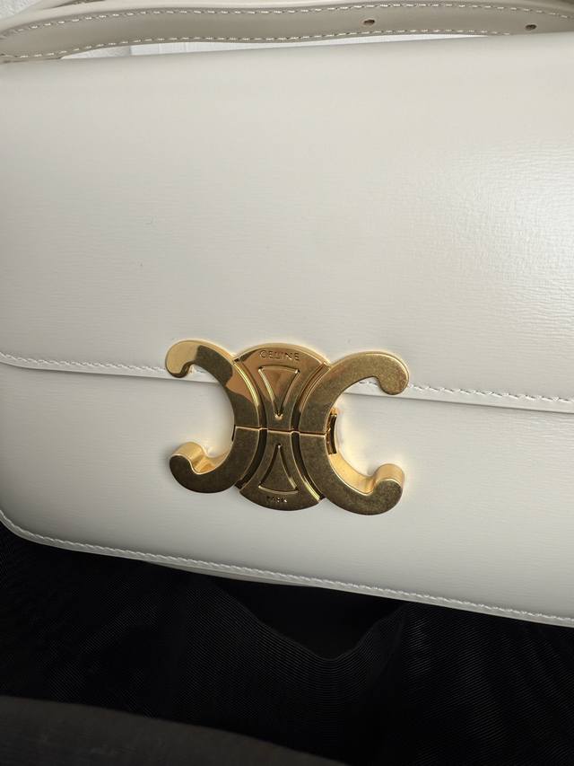 这款采用缎面小牛皮制成的Triomphe小号手袋配有一条可调节的真皮肩带和Triomphe专属搭扣Triomphe 黄铜锁扣