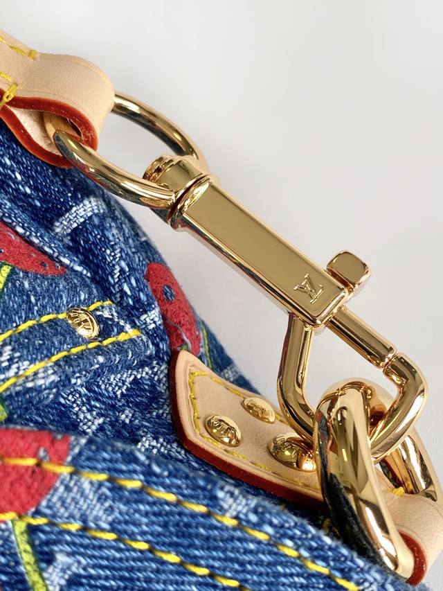 M13680 顶级原单动态163 本款 Sunset 手袋取材Monogram 丹宁布,以复古笔触塑造圆润构型,再借醒目插扣点亮设计。明丽樱桃刺绣彰显路易威登 X 村上隆复刻系列的灵动格调,饰钉皮革肩带完善整体。27.0 X 18.0 X 3.0 厘米 长 X 高 X 宽