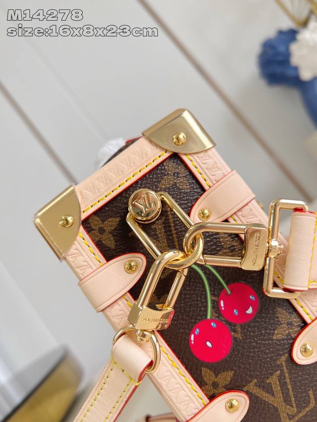 出厂价P 顶级原单 M14278 本款 Side Trunk 中号手袋满载路易威登 X 村上隆复刻系列的灵动意趣,为经典 Monogram 涂层帆布融入甜美樱桃图案,再现日本艺术家鲜明的视觉美学。牛皮革饰边勾勒包身轮廓,铆钉包角和 S-Lock 锁扣致意品牌旅行传承。16 X 8.5 X 23.5 厘米 高 X 宽 X 长度