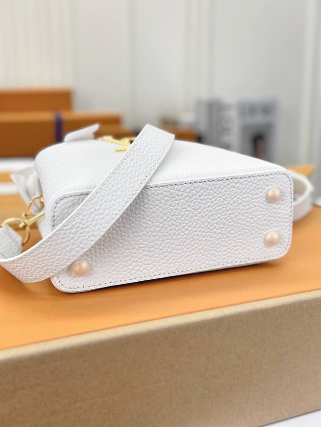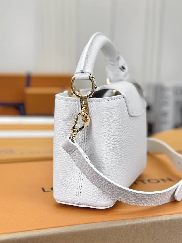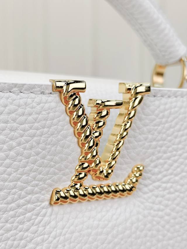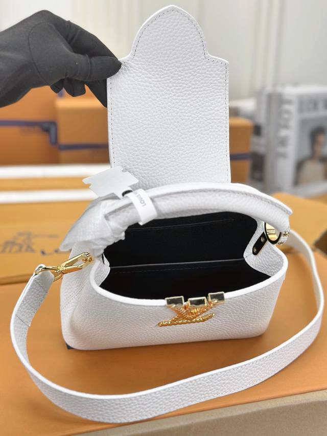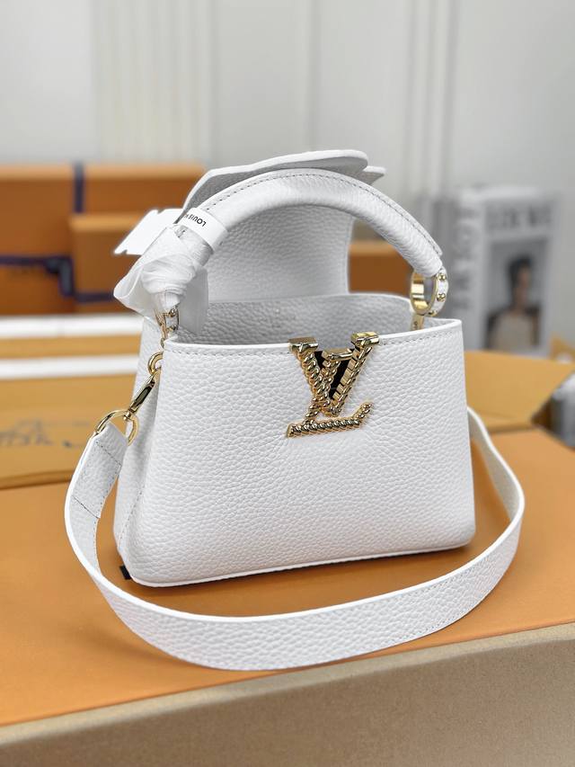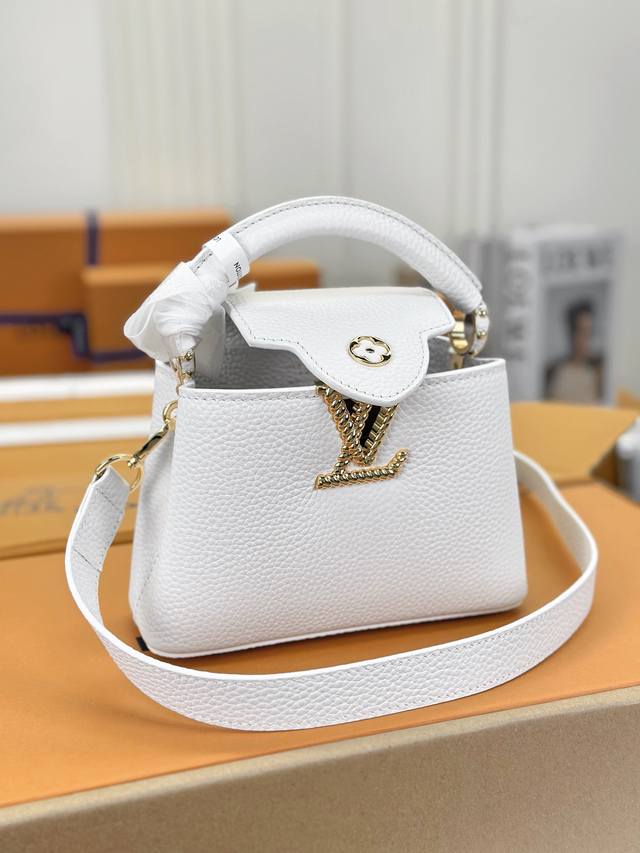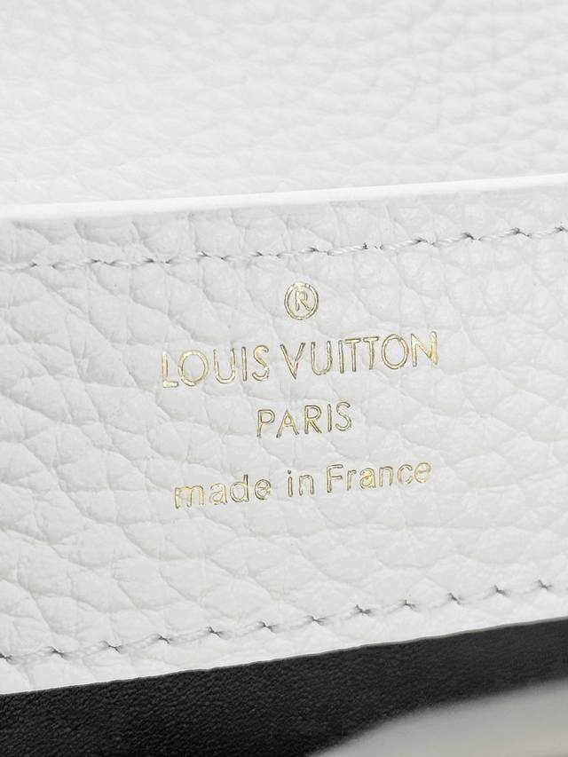 本款 Capucines 手袋出自 Nautical 系列,为 Taurillon 牛皮革融合多重航海元素:正面耀目 Lv 字母采撷船链设计,包裹顶部手柄的围巾致意深邃海洋。可拆卸并调节的肩带方便肩背和斜挎。