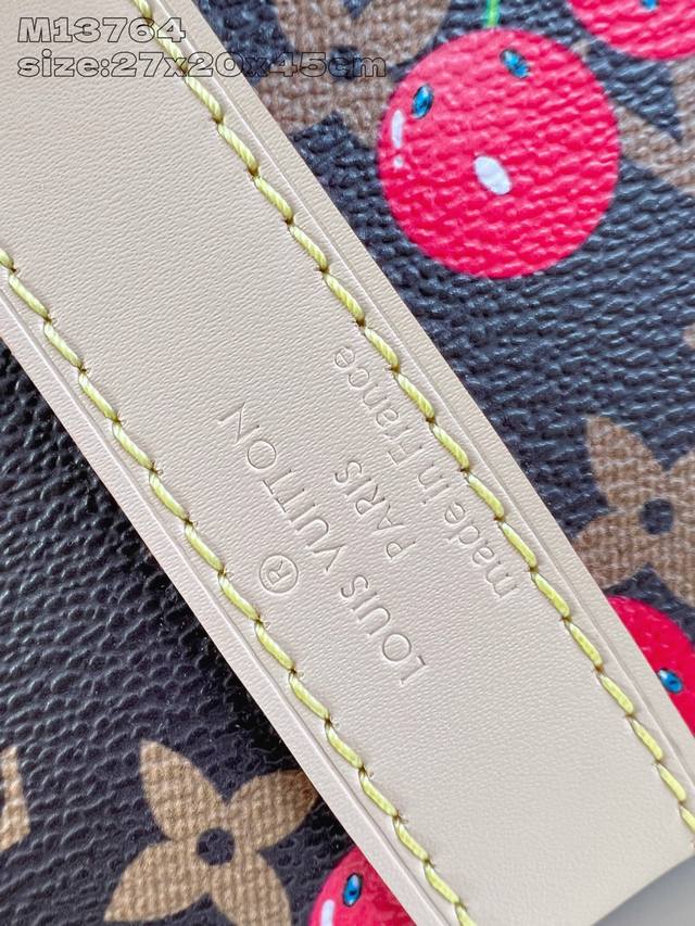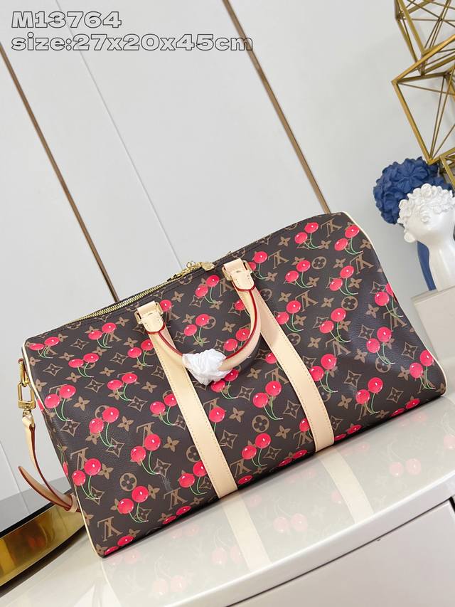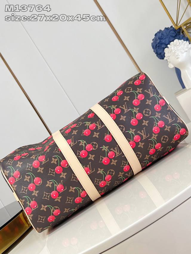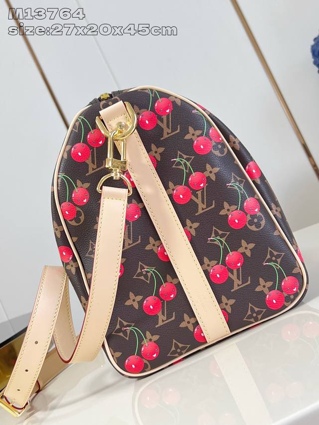 独家实拍 M13764 Keepall BandoulièRe 45 旅行袋借路易威登 X 村上隆复刻系列再焕新颜。经典 Monogram 帆布呈现错落有致的甜美樱桃图案,搭配醒目内衬,道出知名日本艺术家村上隆的玩趣美学。侧带、顶部手柄和可调节肩带流露皮革的自然色泽,耀目金属件完善整体。27 X 20 X 45 厘米 高 X 宽 X 长度