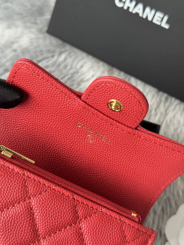 这款卡包实用性更强、颜色如图所示,背面有零钱袋,内里拉链可以放零钱,迷你可爱版 鱼子酱牛皮制作