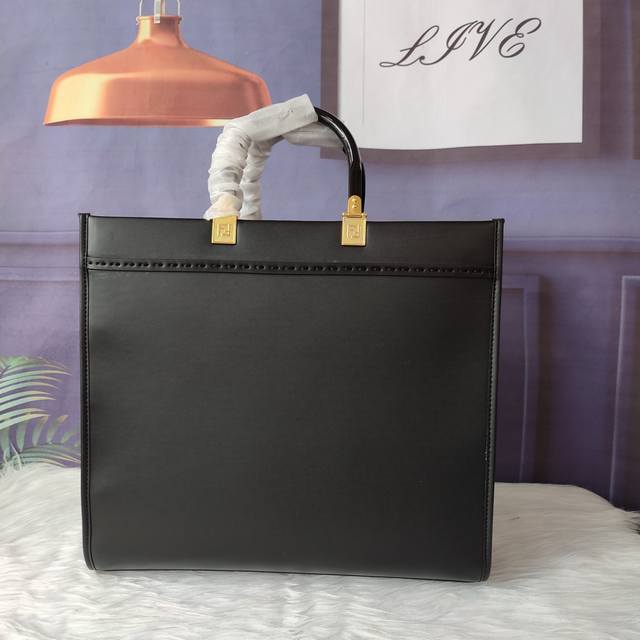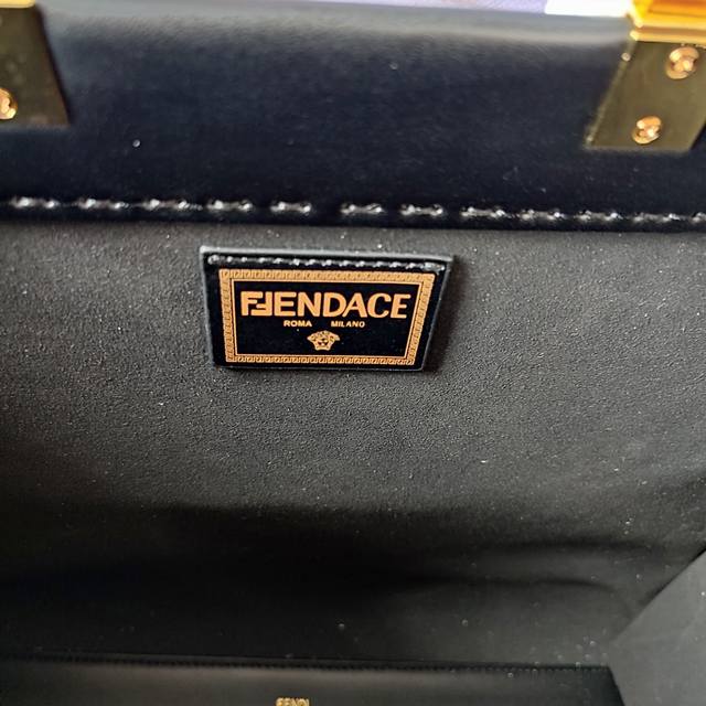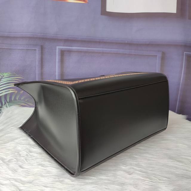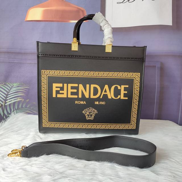 款号8Bh386 Sunshine中号黑色皮革手提袋,饰有烫印Fendace微标,这是Fendi和Versace创意合作系列的标志。黑色机玻璃手提,配有可拆卸肩带,可手提或肩挎。尺寸:35Cm-31Cm-17Cm