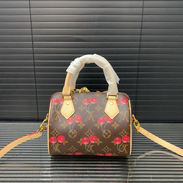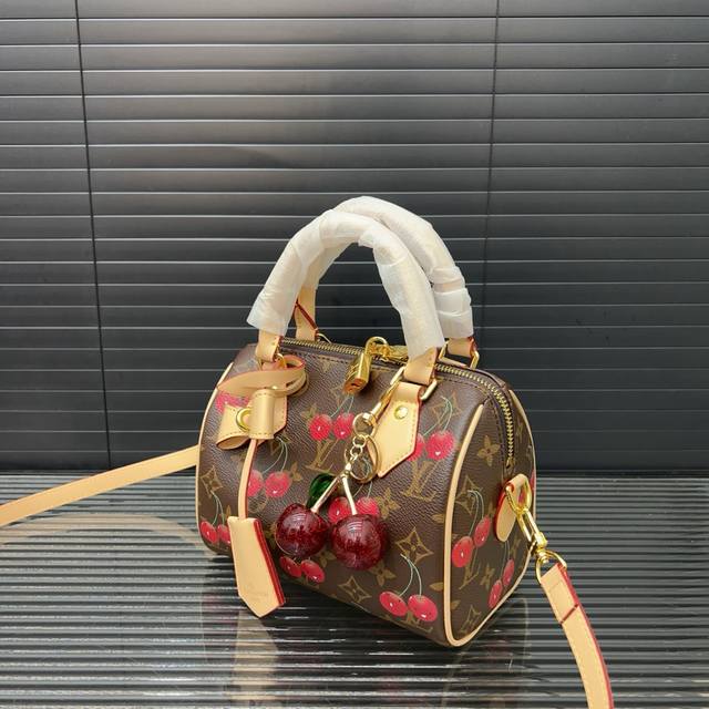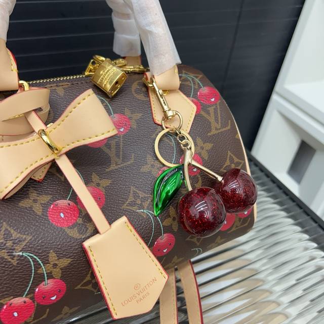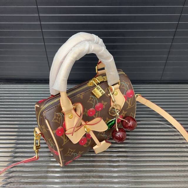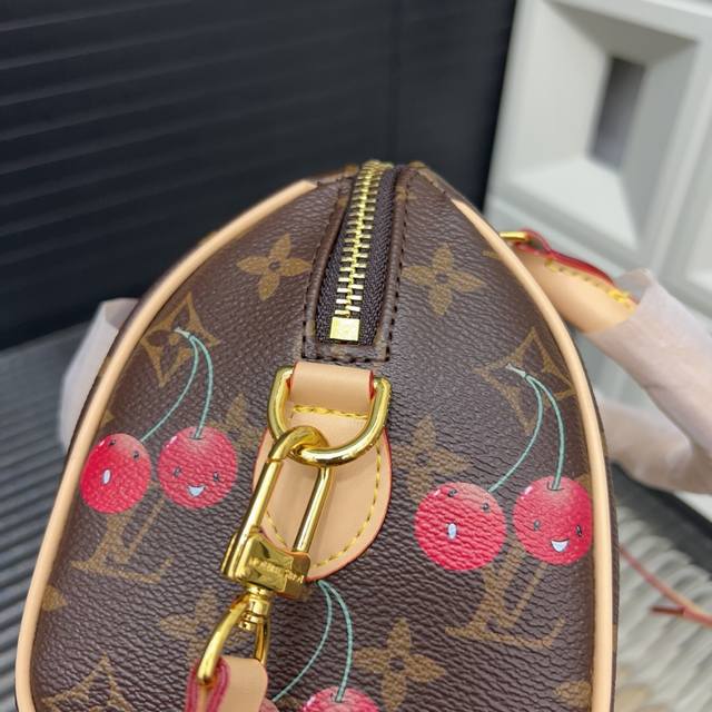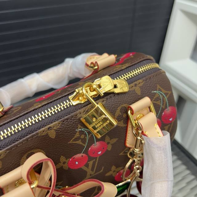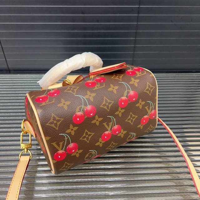 Takashi Murakami村上隆 联名款 Speedy Bandouliere 20 樱桃系列 Monogram Cherry 涂层帆布 单肩斜挎手提包 实物拍摄 配送防尘袋 礼盒 20 X 14 Cm