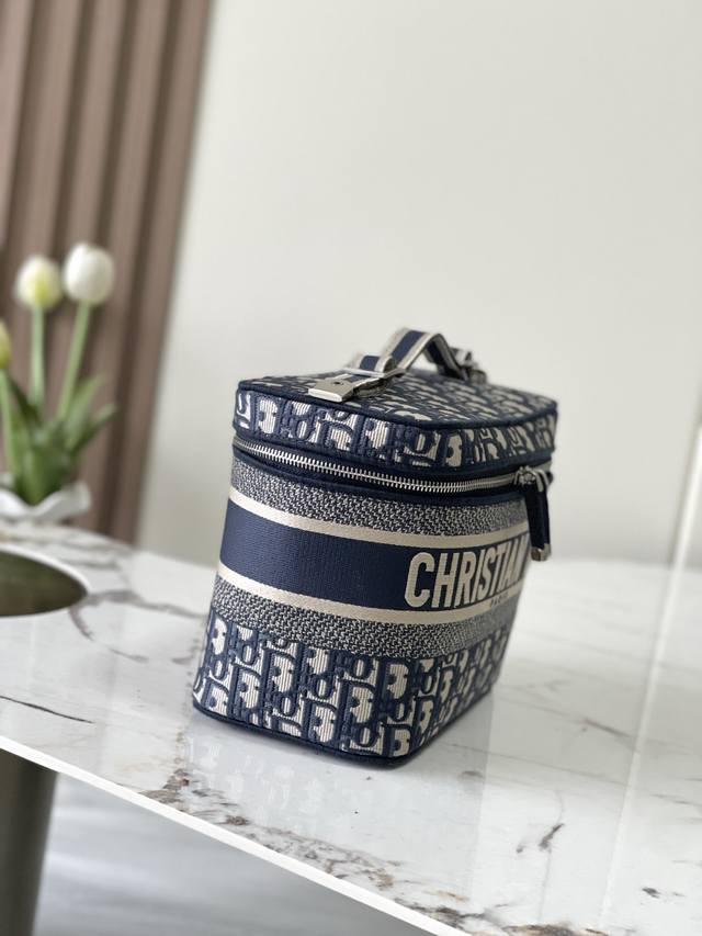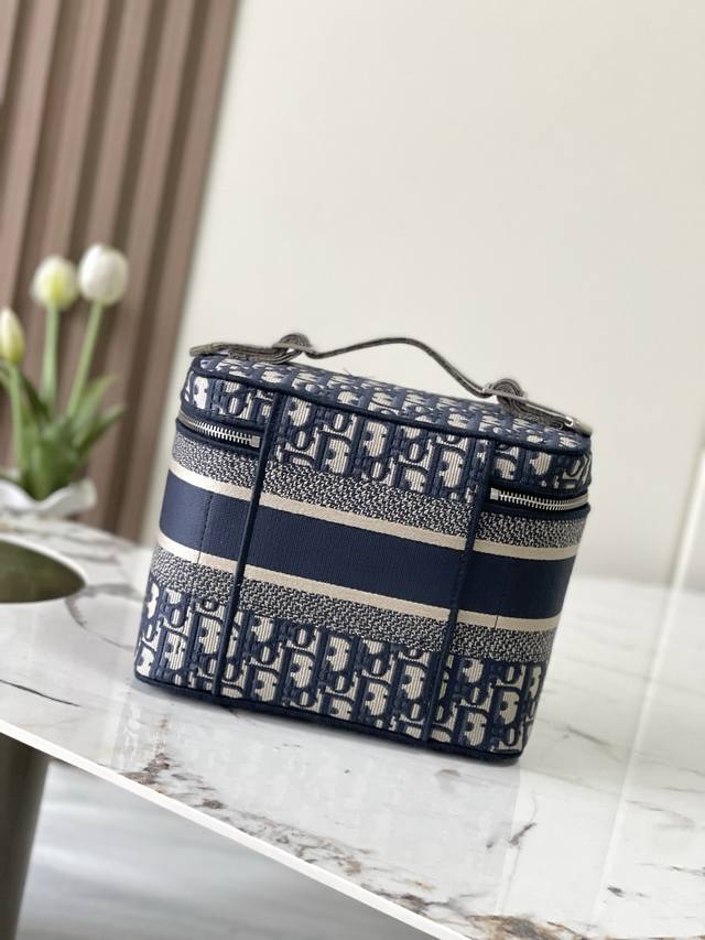 这款 Diortravel Vanity 手袋优雅精巧。通体采用蓝色刺绣