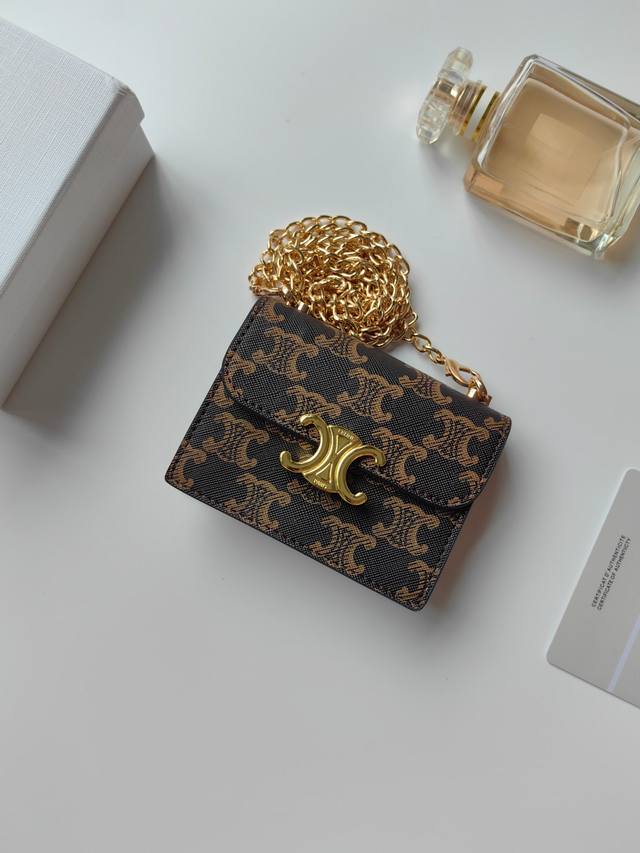 Celine新款链条Triomphe名片包,可斜挎,经典花纹大面内配平纹超纤,金色饰面Triomphe金属按扣开合,1个加厚主隔层,3个内侧卡槽。