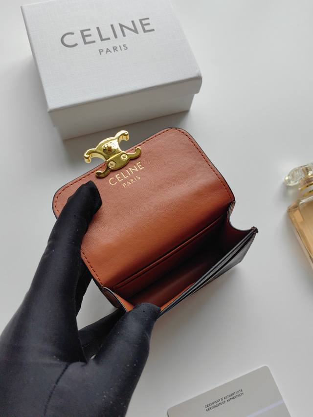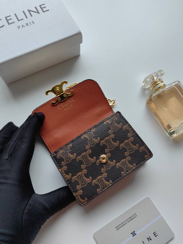 Celine新款链条Triomphe名片包,可斜挎,经典花纹大面内配平纹超纤,金色饰面Triomphe金属按扣开合,1个加厚主隔层,3个内侧卡槽。 编号:10N