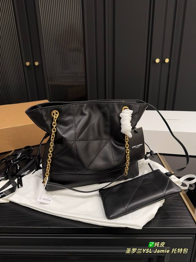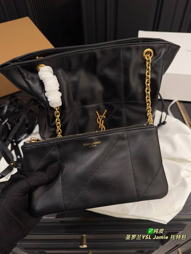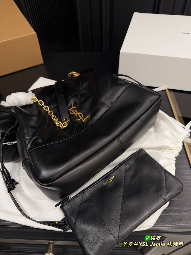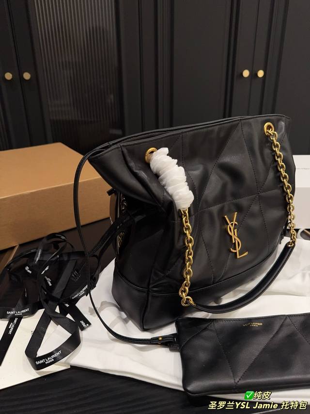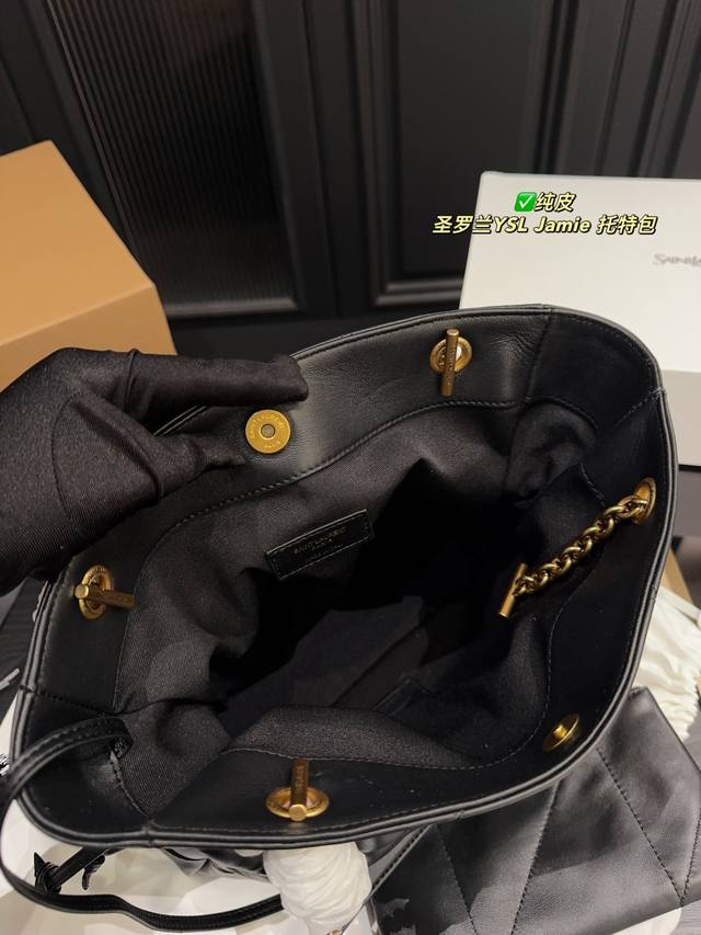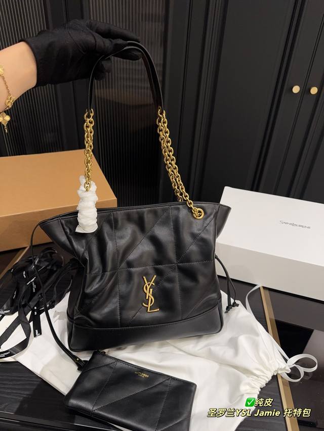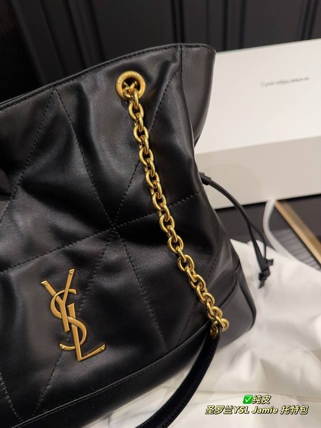 纯皮 配折叠盒27.27 圣罗兰Ysl Jamie 托特包 Ysl圣罗兰托特包,经典黑色,羊皮材质,链条肩带,抽绳设计,多功能背法,容量超大精致设计,能够完美收