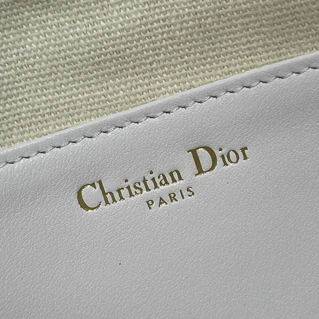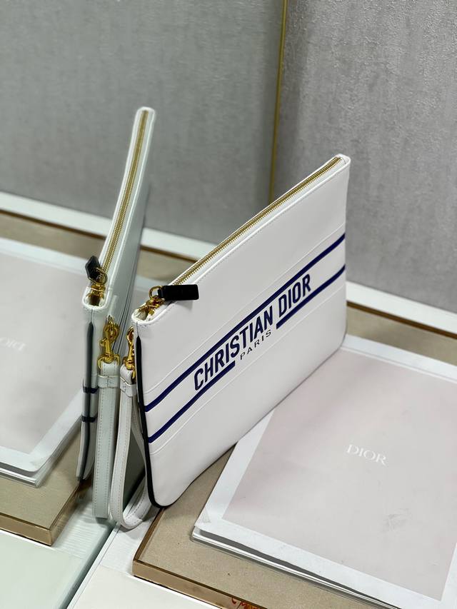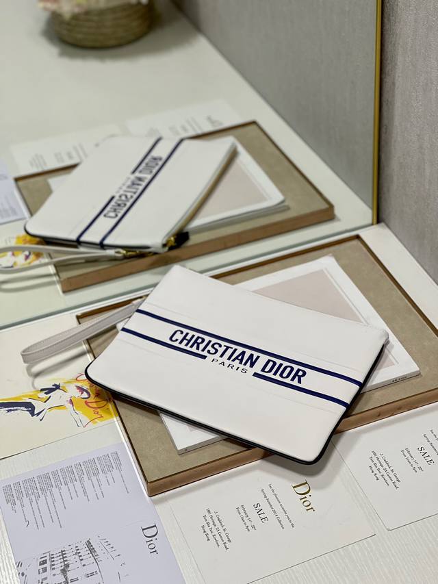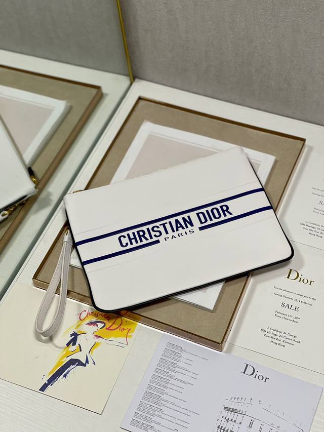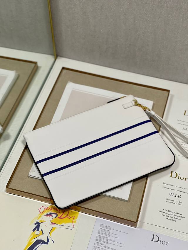Dior新季新款型大号手抓包,采用白色搭配蓝色小牛皮精心制作,正面饰以“Christian Dior Paris”标志,可收纳各种日常小物件,内里配有一个贴袋和6个卡槽,搭配可拆卸的手提带,可手拿或放入手袋中。