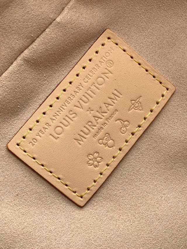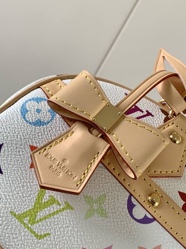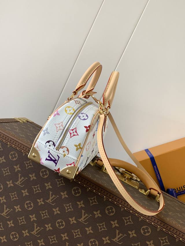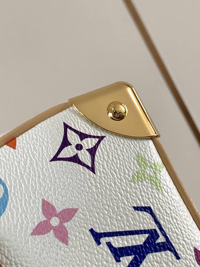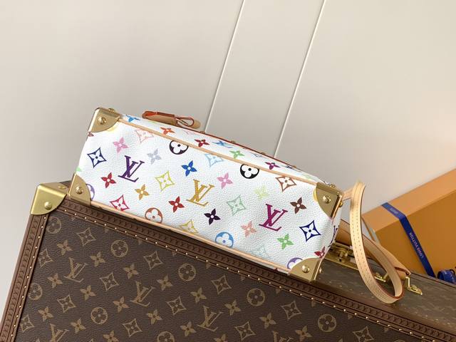 本款 Handbag East West 手袋出自路易威登 X 村上隆再版系列,以艺术家笔下标志性的彩虹色调描摹全幅 Monogram 图案。横向构型线条流畅,顶部手柄、饰钉侧带、可拆卸并调节的肩带和 Lv X Tm 钥匙包融入牛皮革细节,考究包角致意品牌传统行李箱设计。