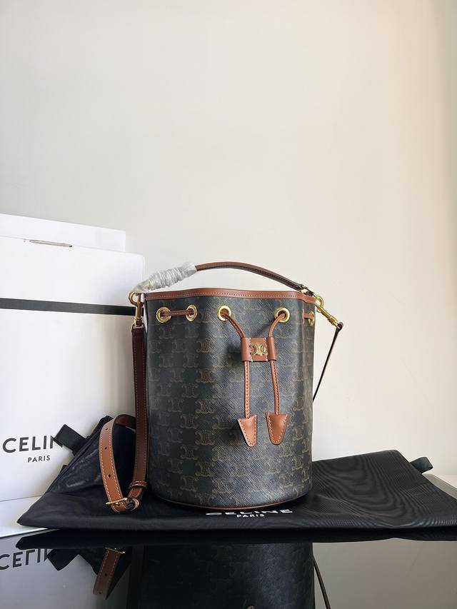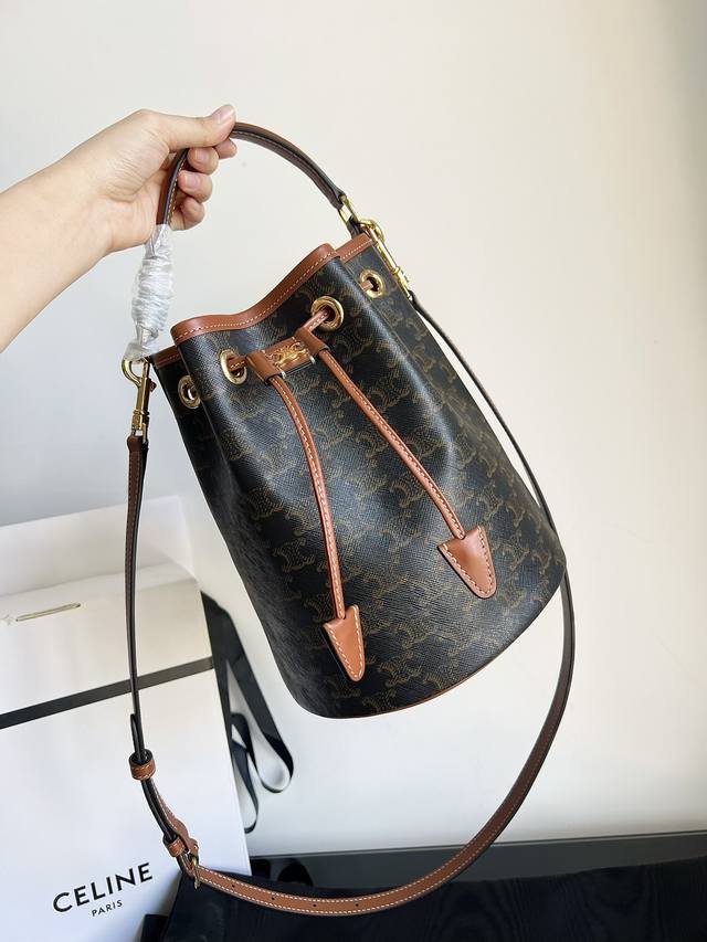 原厂皮全钢五金 新款抽绳手提桶老花Clara标志印花牛皮革手袋,尺寸:20 X 24 X 20Cm,编织印花牛皮革包边,织物衬里,金色饰面,可手提肩背斜挎,配1条可拆卸可调节长肩带