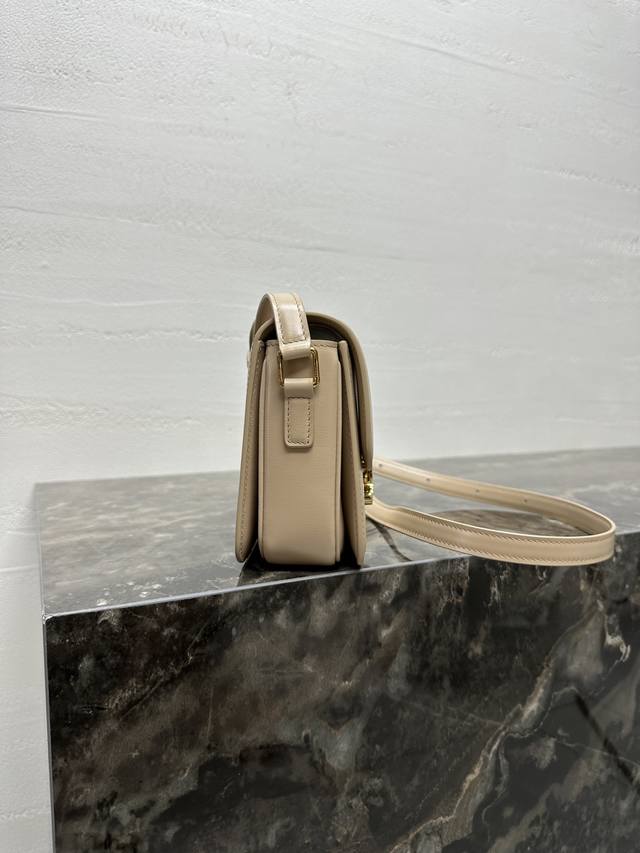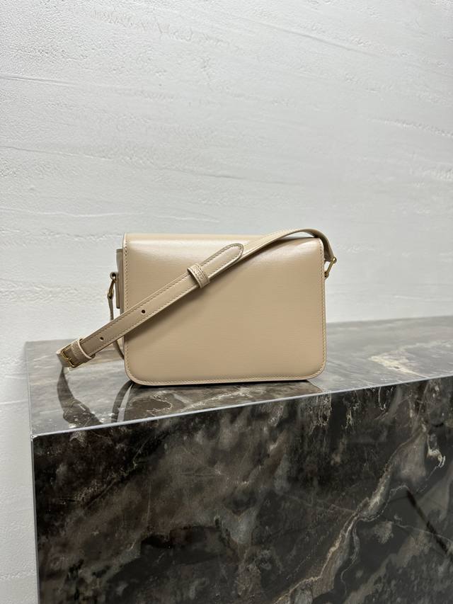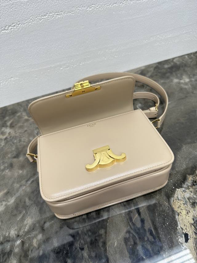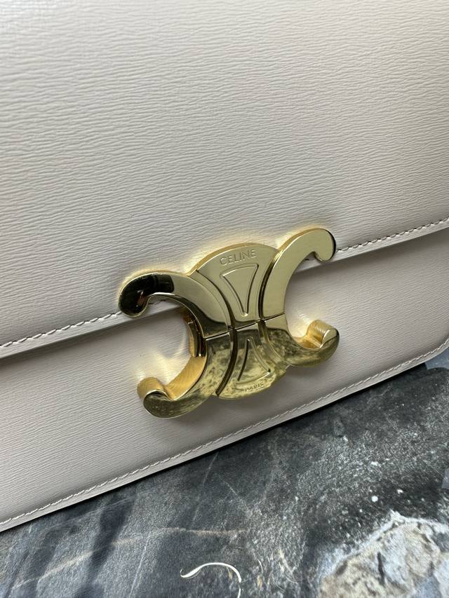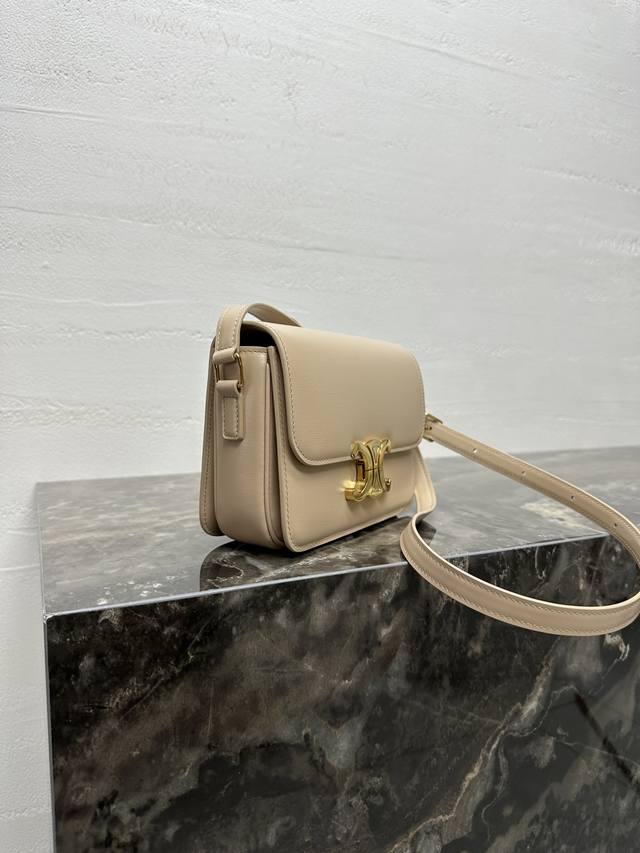 这款采用手搓纹小牛皮制成的Triomphe小号手袋配有一条可调节的真皮肩带和Triomphe专属搭扣