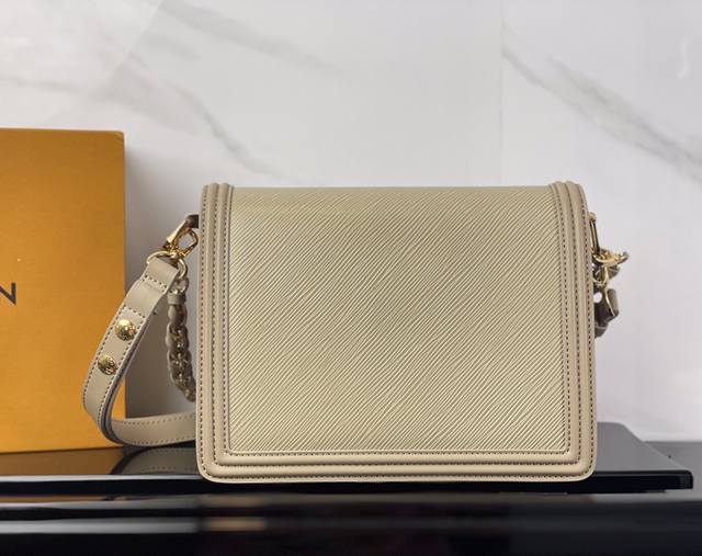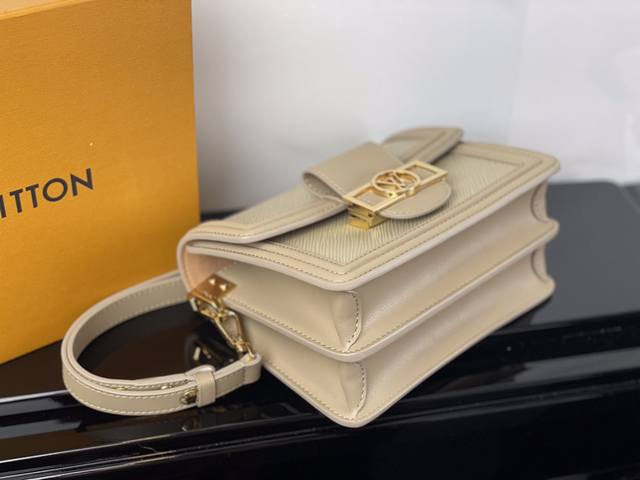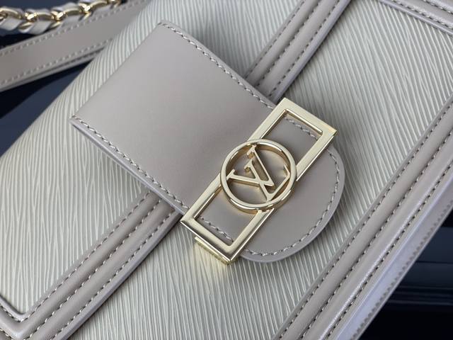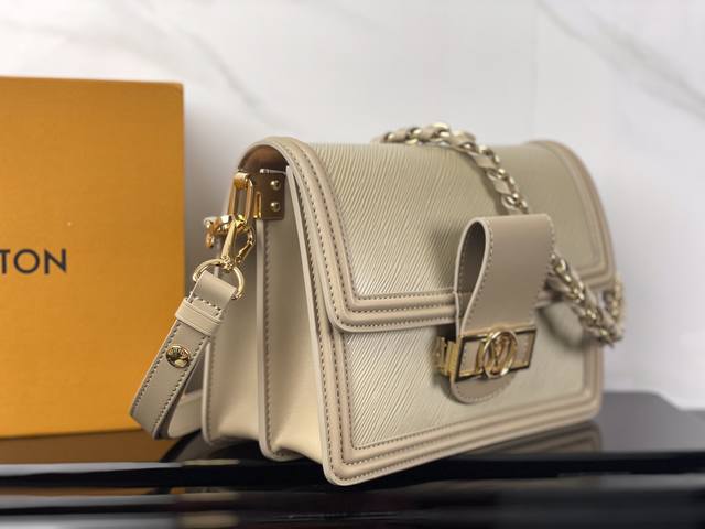 本款 Dauphine 中号手袋结合 Epi 皮革和金属件,为皮革包身压印铭纹图案,搭配光滑牛皮革饰边。Lv Circle 标识嵌于标志性矩形磁扣之中。巧用可拆卸并调节的皮革肩带和编织链条,实现多种背携方式。25.0 X 17.0 X 10.5 厘米 长 X 高 X 宽