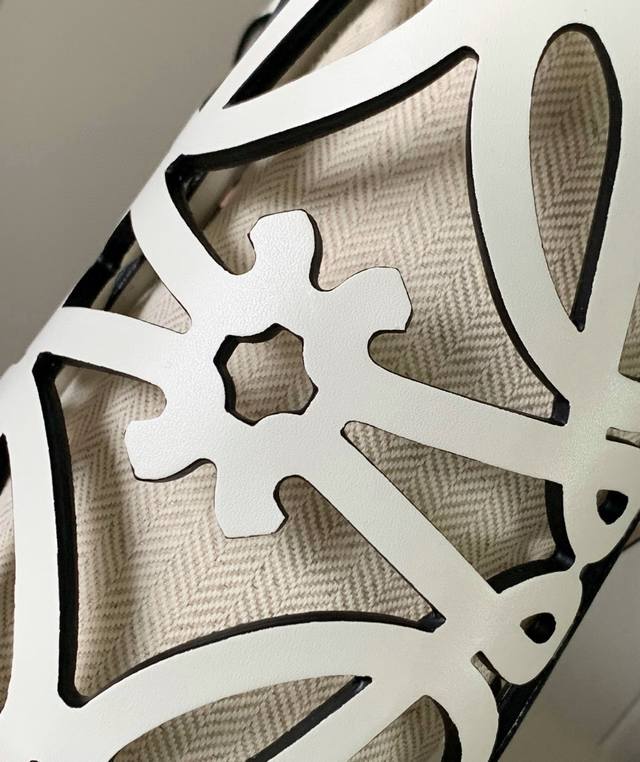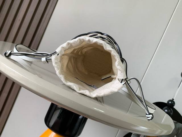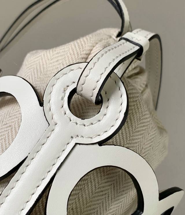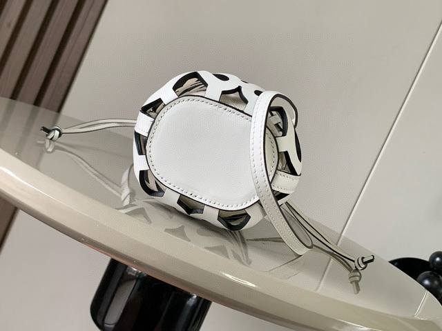 / 经典牛皮革和帆布 Anagram镂空小袋这款多功能的斜挎小袋采用Anagram 图案镂空牛皮革制成并配有绳带和人字纹棉质帆布抽绳内袋个头小小的巨能装适合出游休闲