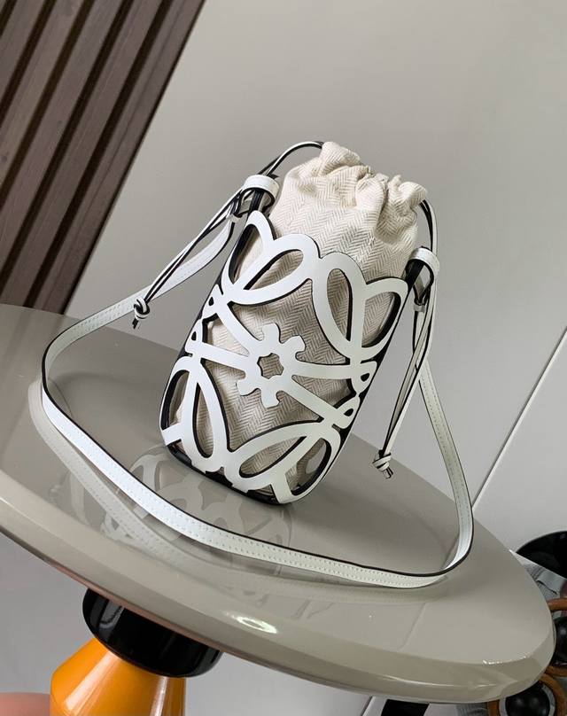 经典牛皮革和帆布 Anagram镂空小袋这款多功能的斜挎小袋采用Anagram 图案镂空牛皮革制成并配有绳带和人字纹棉质帆布抽绳内袋个头小小的巨能装适合出游休闲氛围凹造型神器*斜挎*牛皮革抽绳
