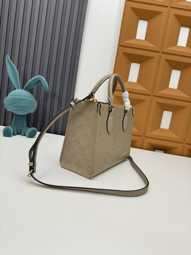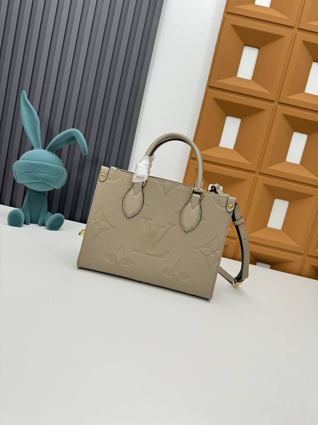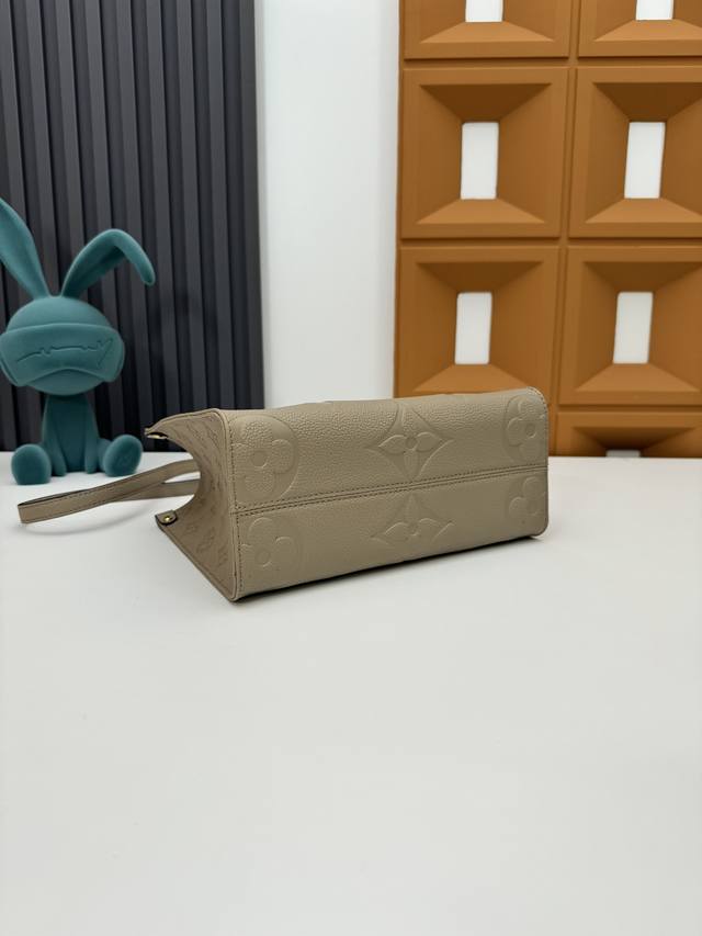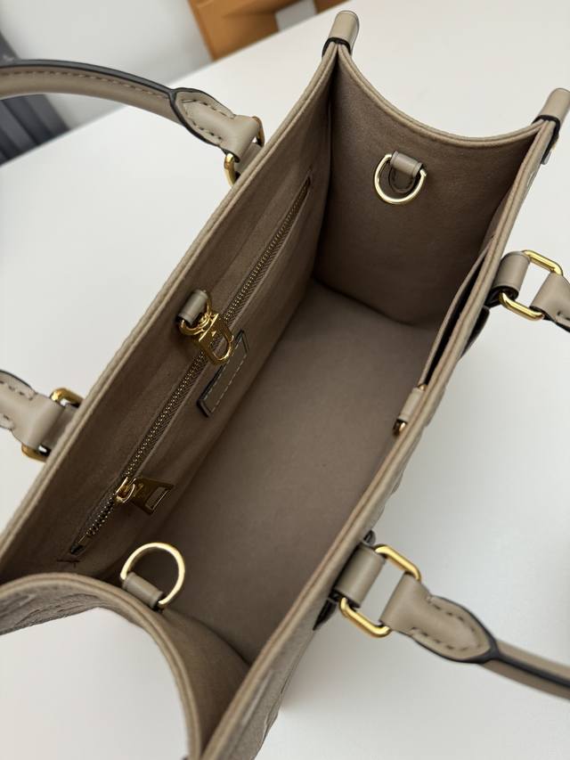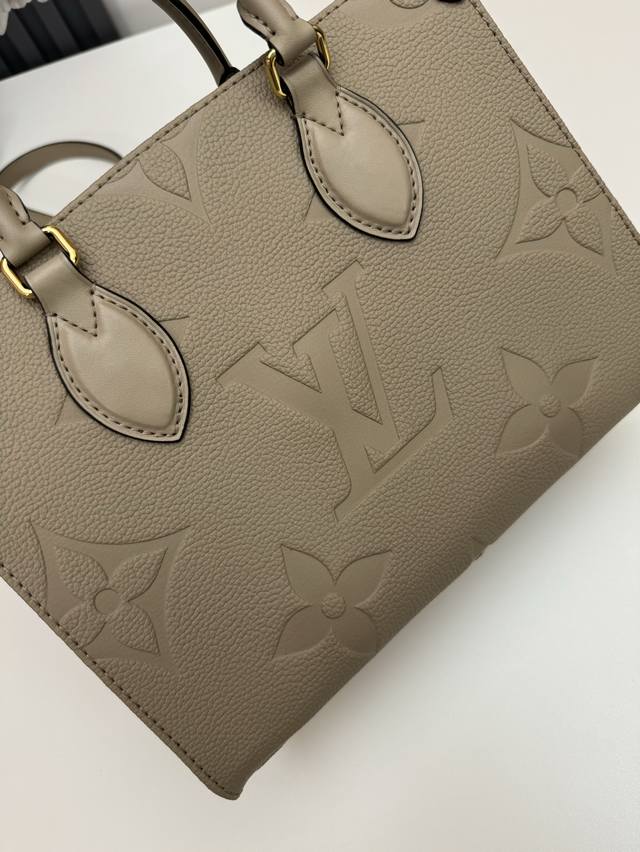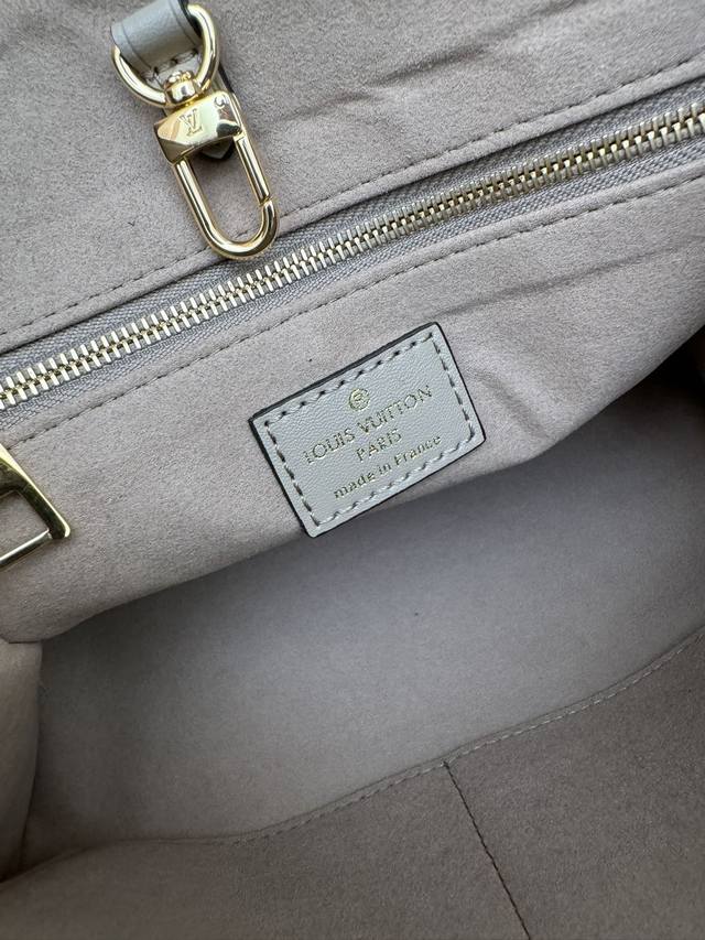 本款 Onthego Tote 包将 Monogram 图案先印染后压印于柔软粒面牛皮,其充裕内里可容纳笔记本电脑及其他办公用品,全皮压大花妈咪袋小Bb号,长短手柄便于手提或肩背。