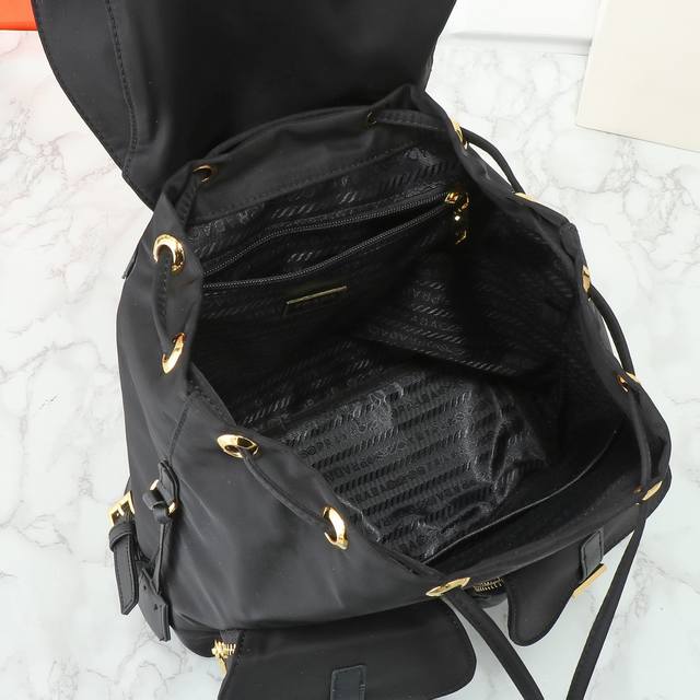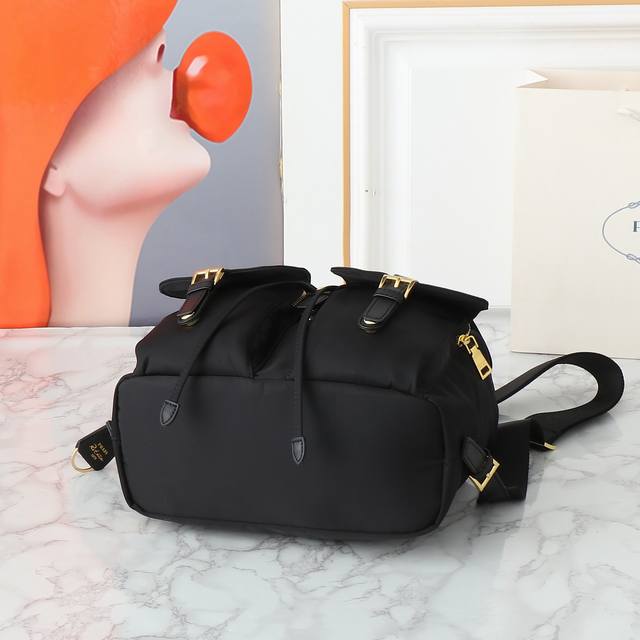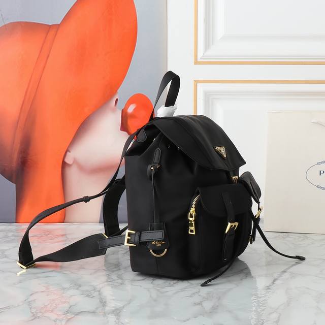 这款实用而创新的背包采用进口尼龙面料,可调式肩带和编织提手,可拆卸Re-Edition皮革钥匙环,正面搭扣翻盖口袋,翻盖涂珐琅三角形金属徽标,束绳开合,徽标印花Re-Nylon衬里配两个内袋,其中一个带拉链,容量客间大。经典又实用,又是一款永久不过时的爆款