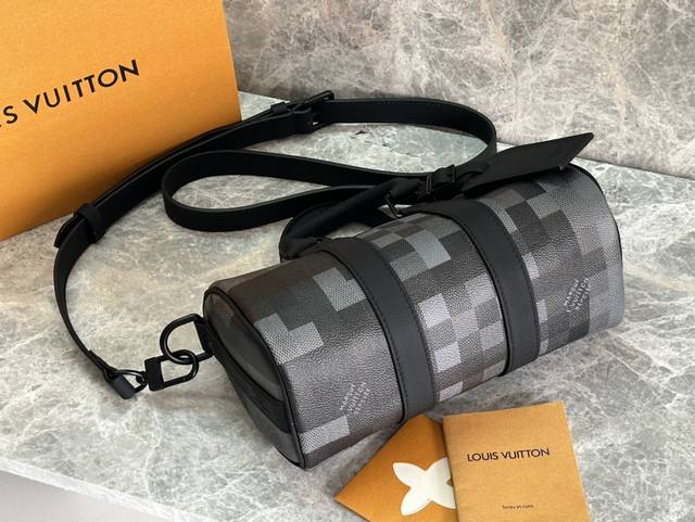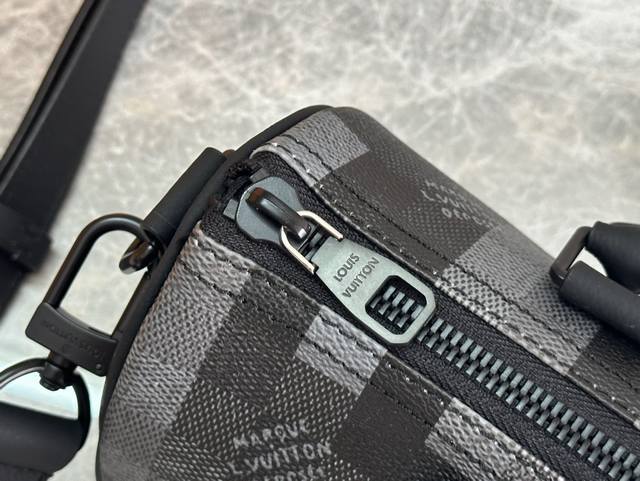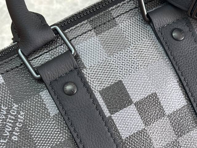 本款 Keepall BandoulièRe 25 手袋取材 Damoflage Black Cc涂层帆布,生动再现 Pharrell Williams 创意美学下的 Damier Graphite 图案。经典格纹呈现像素化效果,并以深邃色调营造别致迷彩外观。顶部手柄与可拆卸并调节的肩带提供多种背携选择。