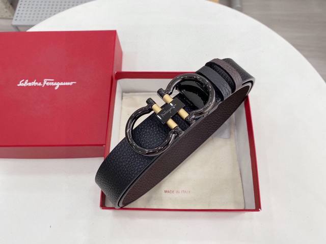 菲拉格慕 原单双面进口小牛皮带身.黑与咖啡双色一体,正反两面可用,搭配原单精品钢扣。原产皮料定制,专柜宽度3.5Cm....