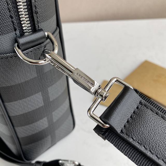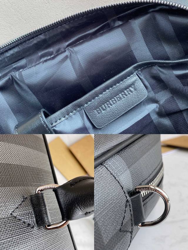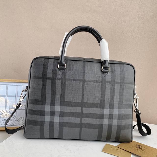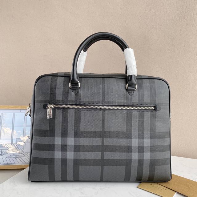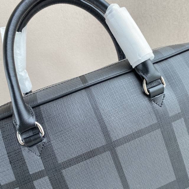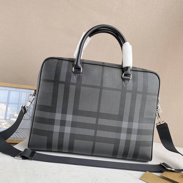 London 格纹公文包,搭配皮革边饰。可缔造手提造型,或使用可拆式背带便于肩背。
