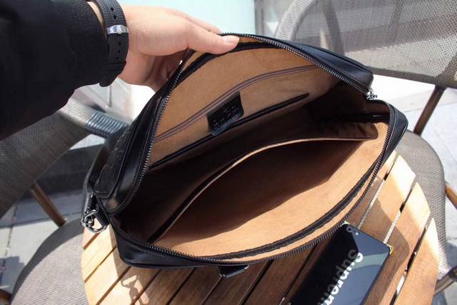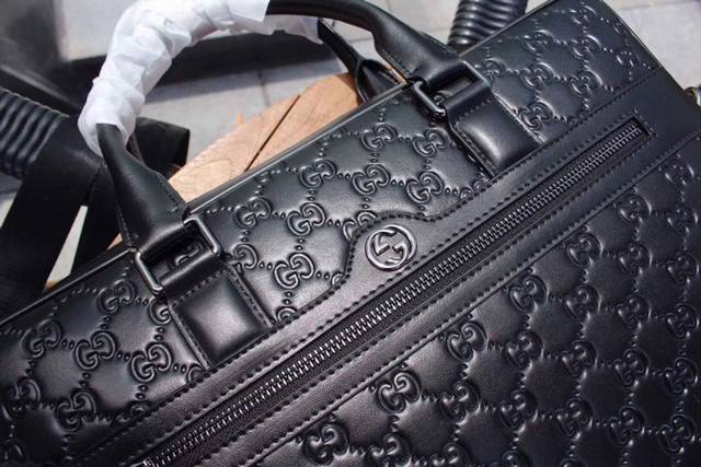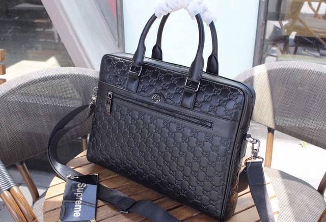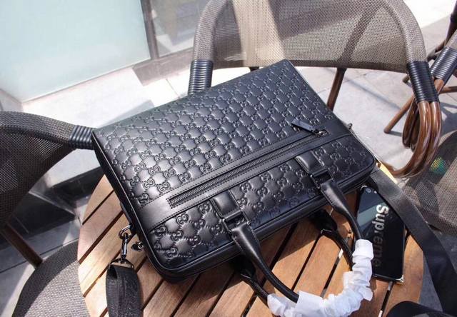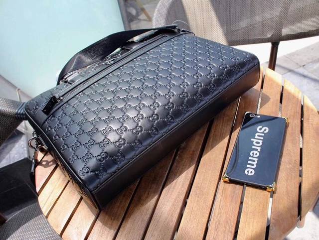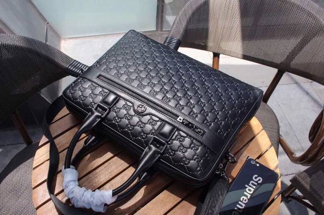 Guccl古奇 独家新款 型号 33113-5商务休闲包 尺寸 38X29X6Cm 颜色 黑色 高端品质 顶级做工 材质 古奇Guccl 专柜代购新款原厂进口头层牛皮正宗进口古奇五金及拉链皮质柔软手感独特的品质时尚与经典复杂的手工构制潮男必备
