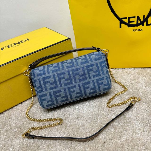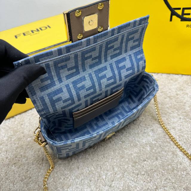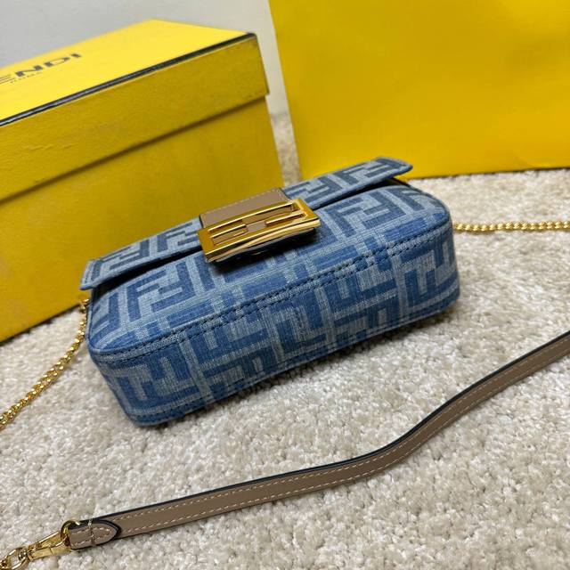 / 标志性Baguette小号手袋,浅蓝色牛仔布料材质,饰有Ff图案,采用米色小牛皮饰边并缀以Ff搭扣。正面翻盖、磁扣、有布料衬里的内部隔层,配有口袋和金色饰面金属