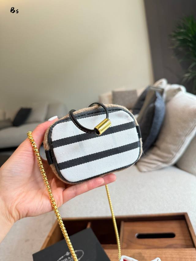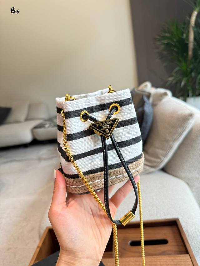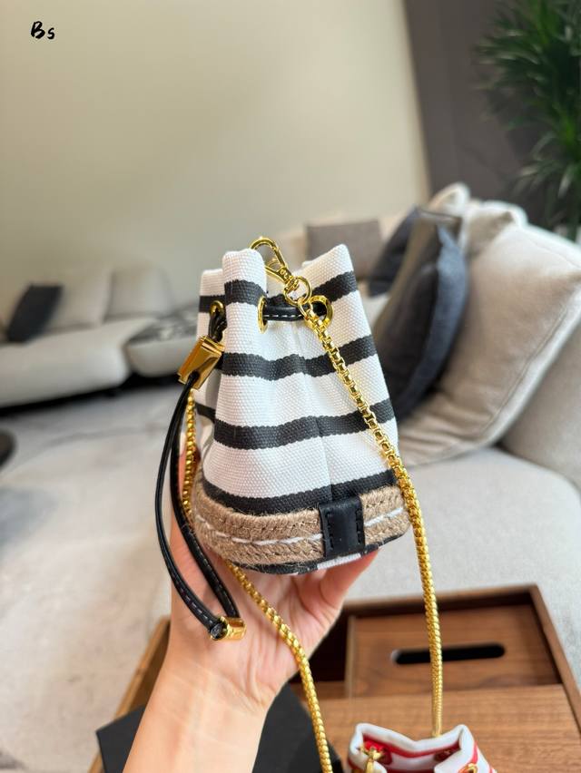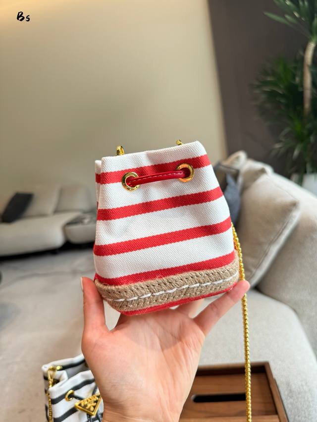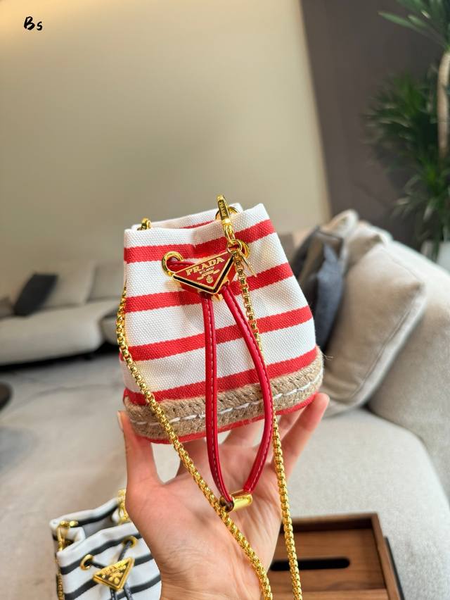 这款迷你小包崭新诠释经典航海风元素,呈现典雅的夏日质感与精致细节。选用条纹织物打造,底部的设计灵感源自草编鞋,搭配皮革抽绳与精致可拆卸肩带。太可爱了国可仙可酷,难道你不心动回国夏天必备,美妞们,赶紧入手吧。又是-款永久不过爆款长9X高9.5X底6Cm.