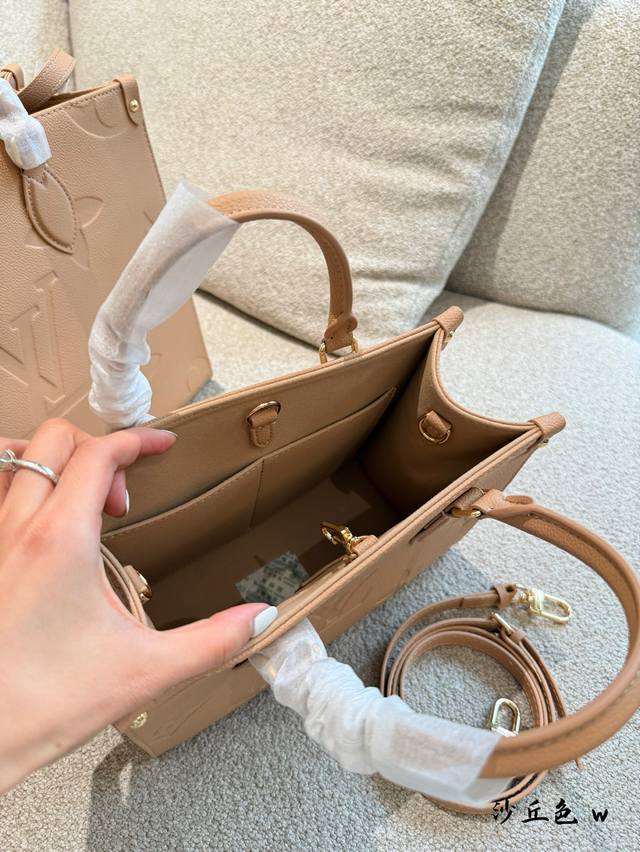 Lv新款Onthego沙丘色 一眼心动大字母压印于柔软粒面牛皮 长短手柄便于手提或肩背 小号精致百搭又能装 而且包包自重轻便于出门 浪漫甜美的风格,真的让人无法