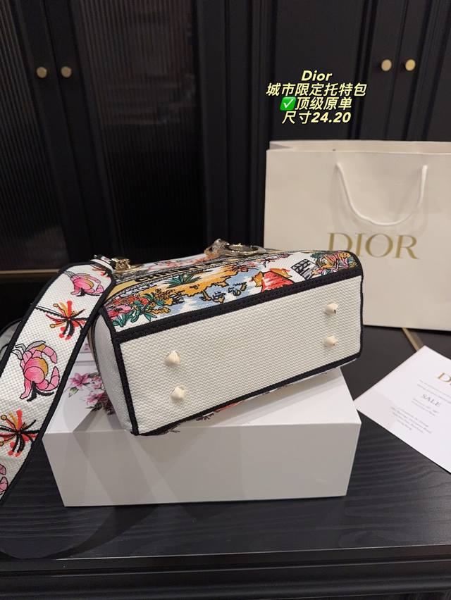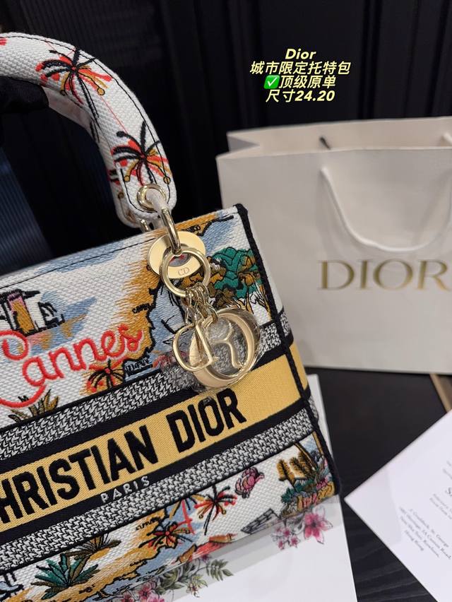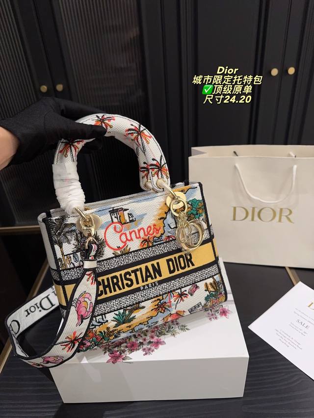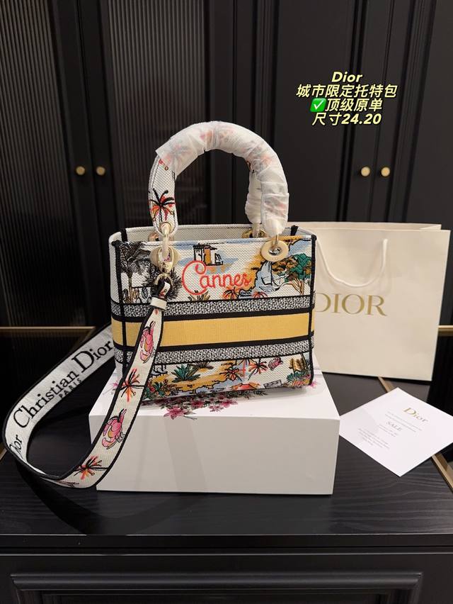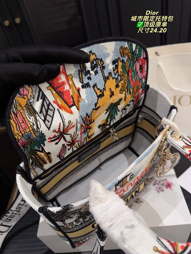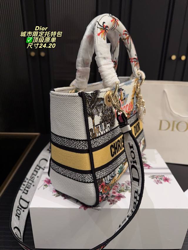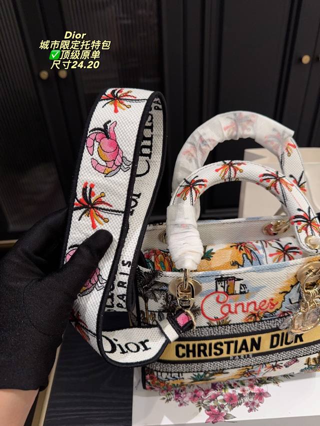 采用自然色酒椰草效果面料和棉质刺绣面料精心制作,突显多色St-Tropez Dior Souvenir 图案,运用缤纷色彩突显当地的鲜明特色,生动展现这处倍受 Dior 珍视之地的风采。中号款式,正面饰以 Christian Dior Paris 标志,彰显 Dior的精湛工艺,可手提或肩背,与其他 Dior Souvenir 图案单品理想搭配。