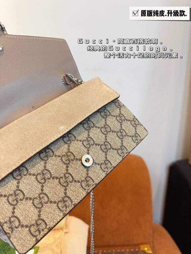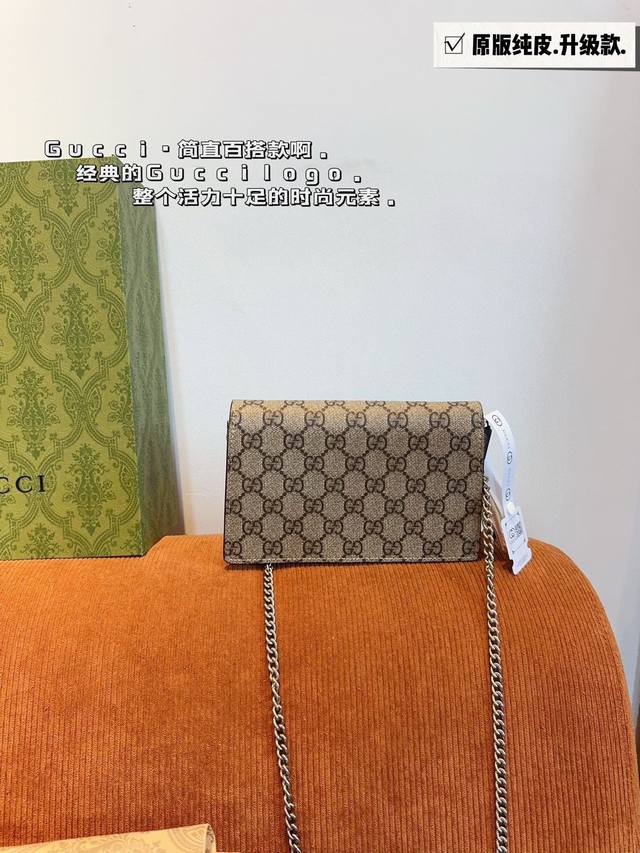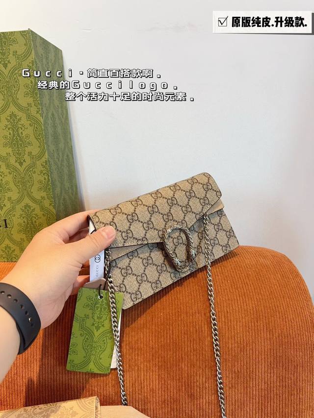 配盒 Size:25×15 Gucci 古驰新品老花酒神链条包 在品牌标志复古做旧虎头锁扣之上 增加了时尚个性的精致手柄,...