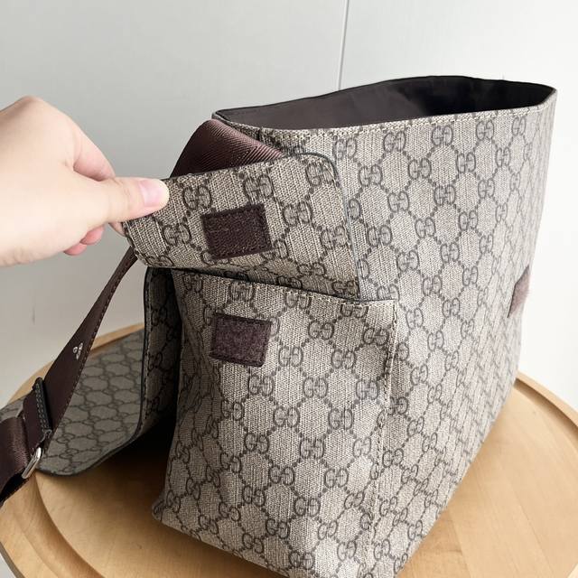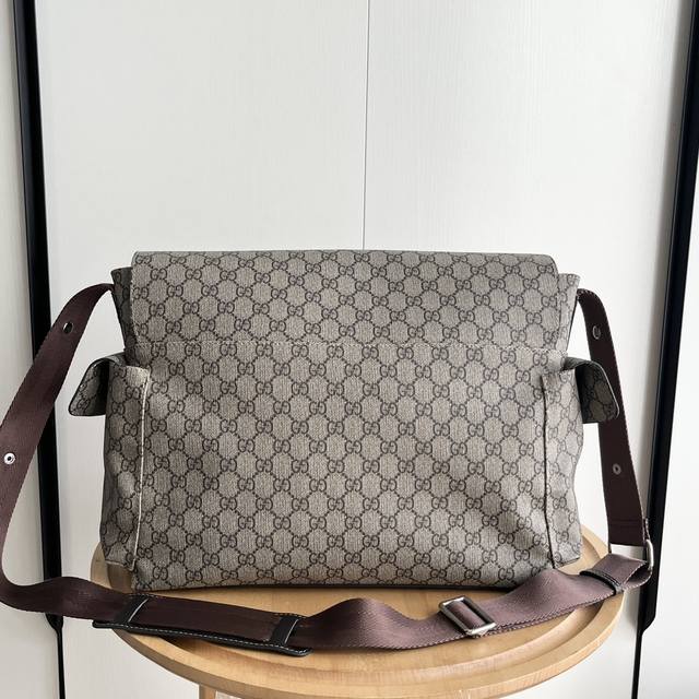 Gucci 大火妈咪包又称Diaper Bag,容量很大,两边有侧口袋可容纳水瓶。大翻盖设计很是方便,配有折叠垫子。男女通用款!采用进口面料和啡色皮革搭配,肩带调节