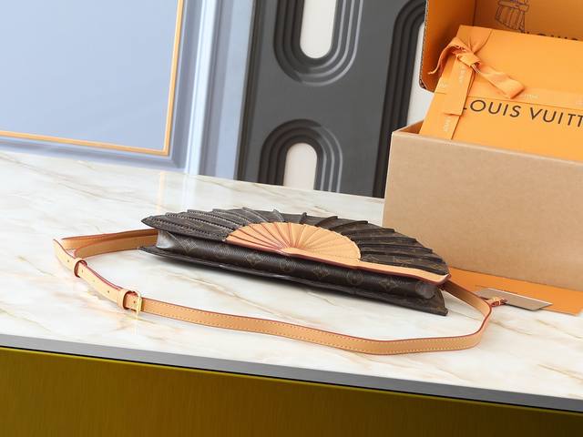 / 升级原版 M14804 Lv Fan 手袋取材 Monogram 帆布,以别致设计亮相 2025 春夏秀场,成就收藏家之选。皮革之上点缀 Monogram 花卉
