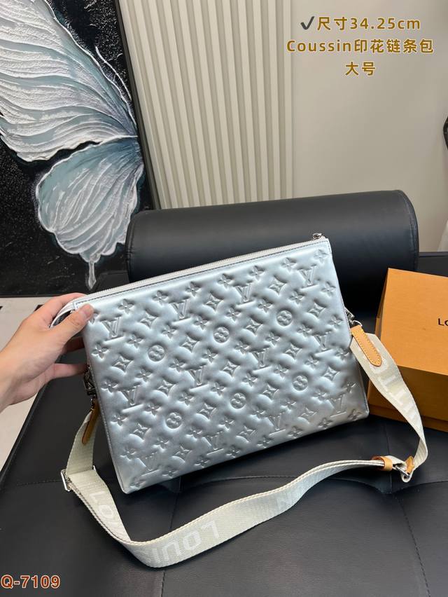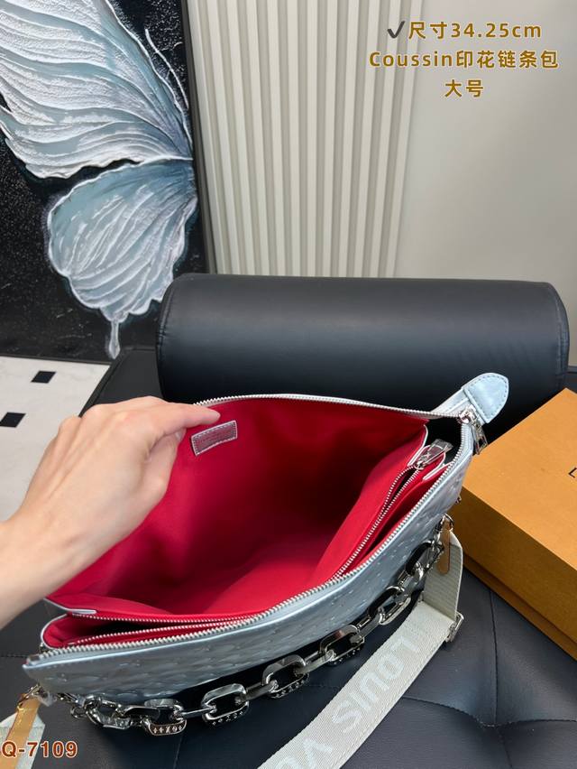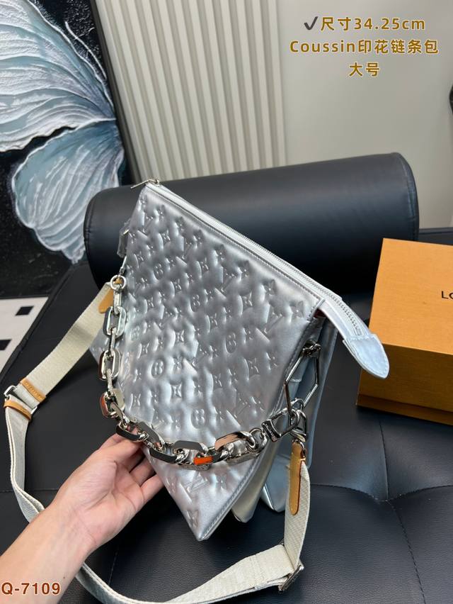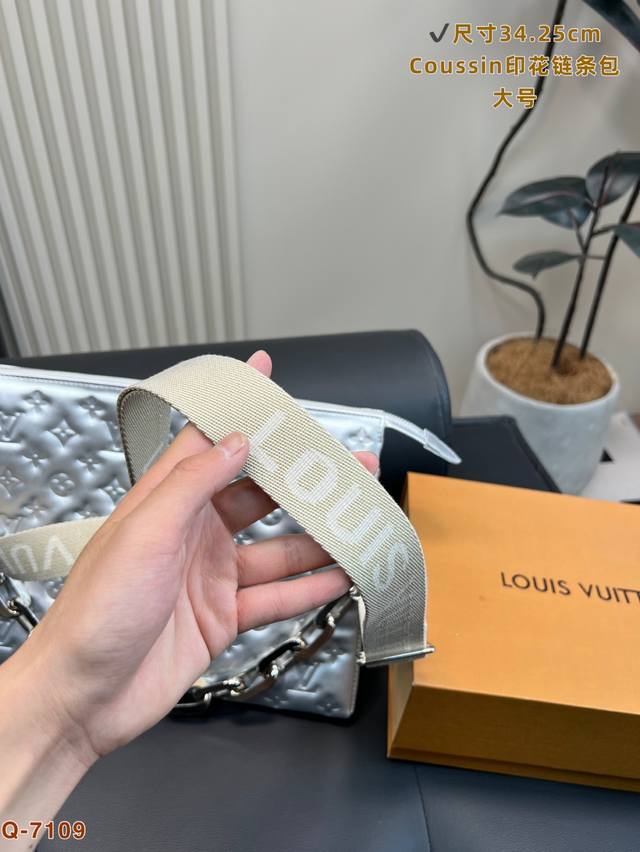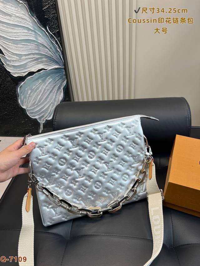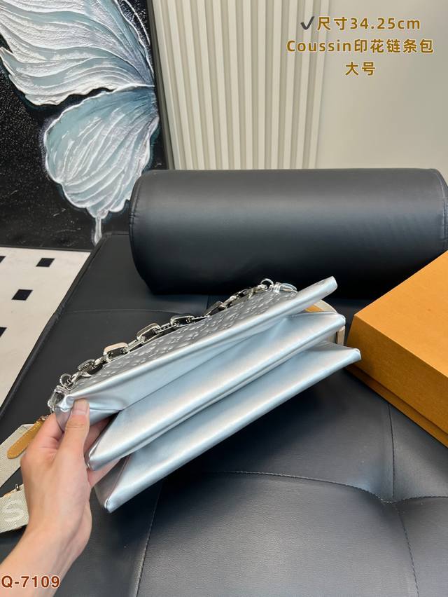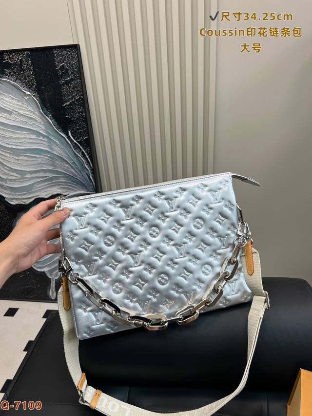 全新升级Lv 走秀新款Cousin抱抱包 金属色,目测又是下一个女明星,时尚博主必备单品,I独有的亮银色金属,作为本次设计的肩带粗链条,抓眼球效果非常到位,肩带可拆卸变成手包,妥妥的凹造型!