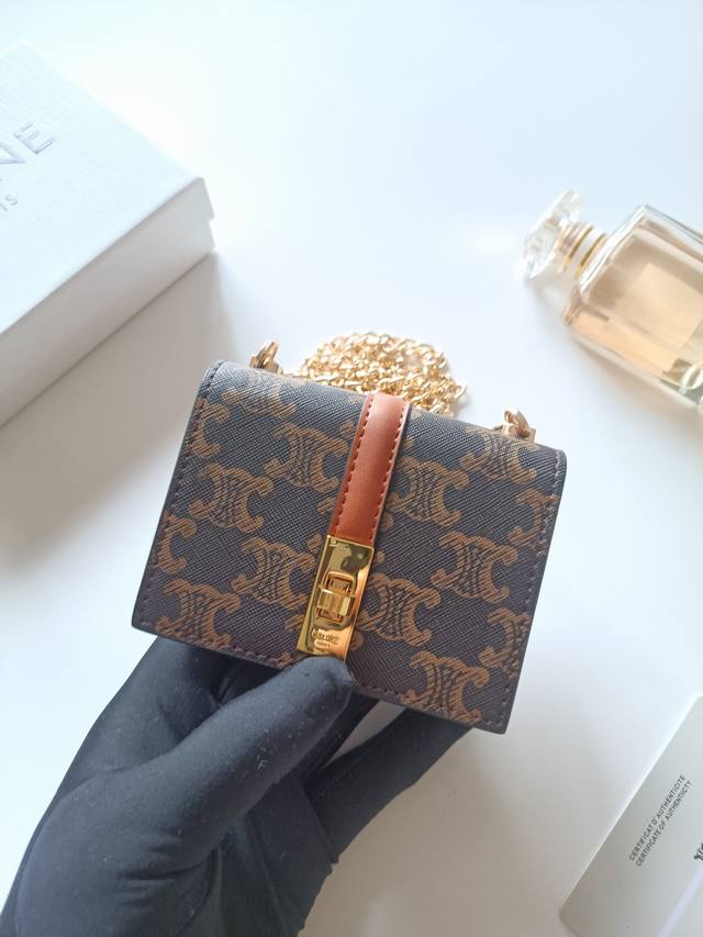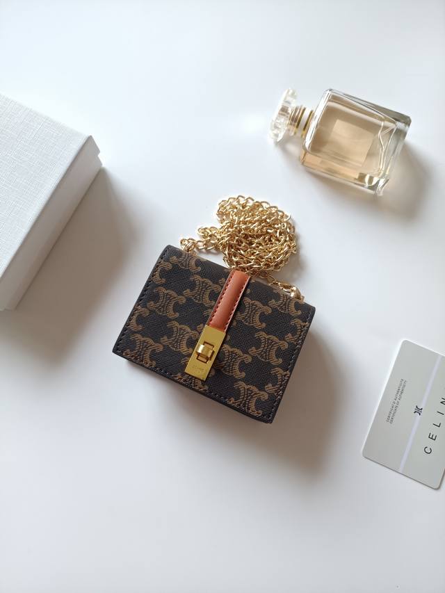 Celine最新链条卡包,Triomphe翻盖链条卡包,可斜挎,经典花纹内配平纹超纤,旋转锁扣开合,1个加厚主隔层,2个内侧卡槽。