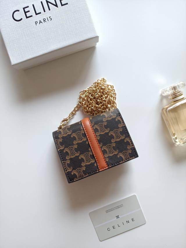 / Celine最新链条卡包,Triomphe翻盖链条卡包,可斜挎,经典花纹内配平纹超纤,旋转锁扣开合,1个加厚主隔层,2个内侧卡槽。 编号:10M472 尺寸:1