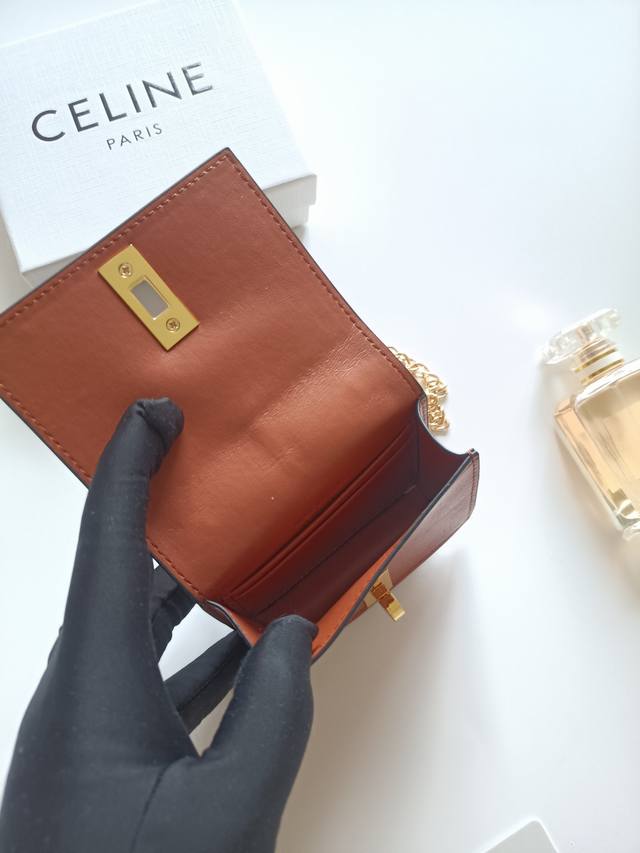 Celine最新链条卡包,Triomphe翻盖链条卡包,可斜挎,经典花纹内配平纹超纤,旋转锁扣开合,1个加厚主隔层,2个内侧卡槽。 编号:10M472 尺寸:1