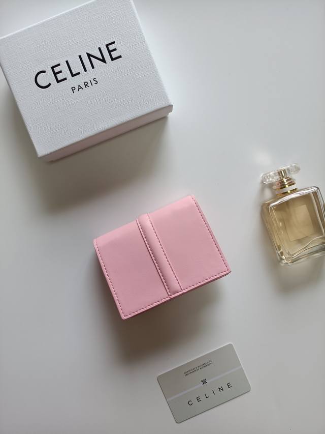 Celine新款卡包,Triomphe翻盖卡包,经典花纹大面内配平纹超纤,旋转锁扣开合,1个加厚主隔层,2个内侧卡槽。