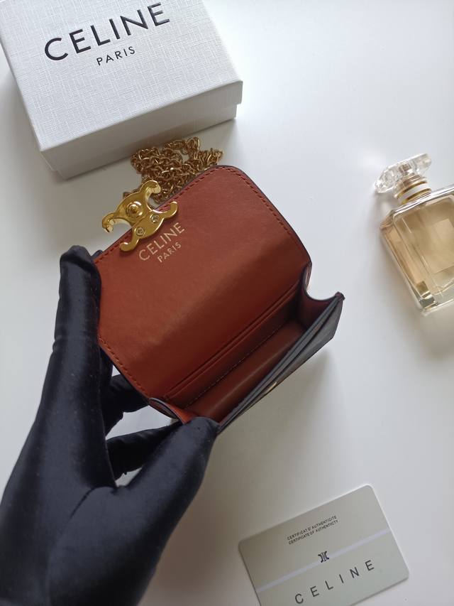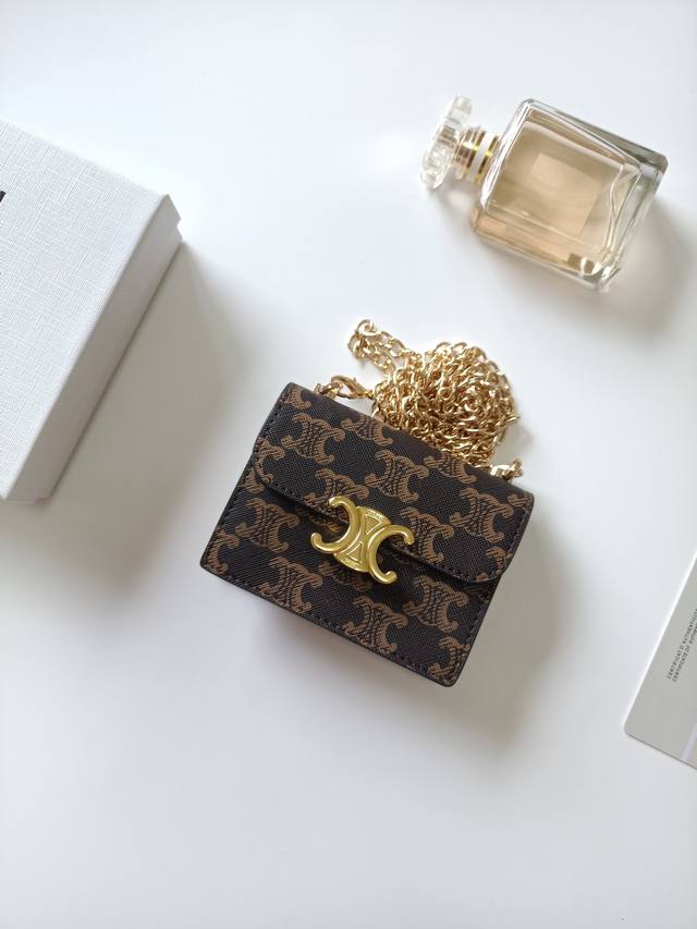 Celine新款链条Triomphe名片包,可斜挎,经典花纹大面内配平纹超纤,金色饰面Triomphe金属按扣开合,1个加厚主隔层,3个内侧卡槽。