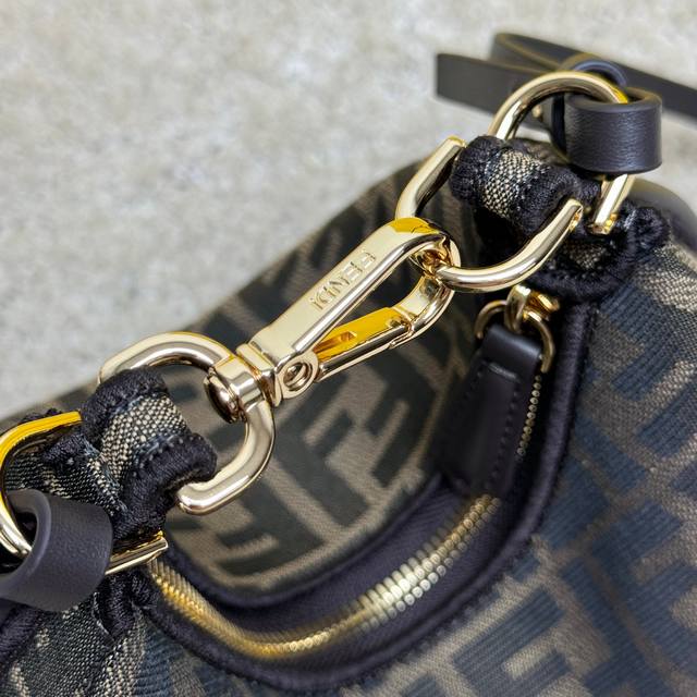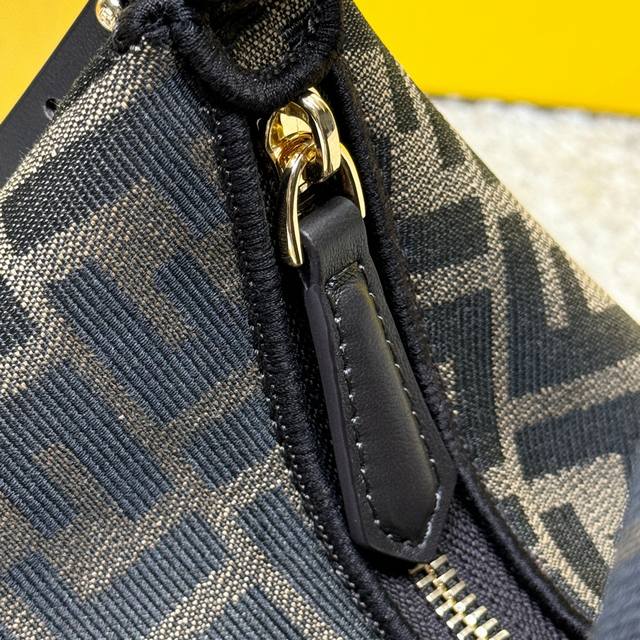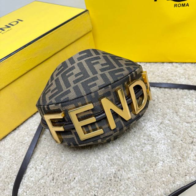 / 迷你新月包,棕色Ff提花图案布料材质,饰有复古金色金属Fendi字样。 拉链开合,设有布料衬里内隔层,配金色金属件。 钩扣可作为提手手提,或搭配可调可拆式细肩带