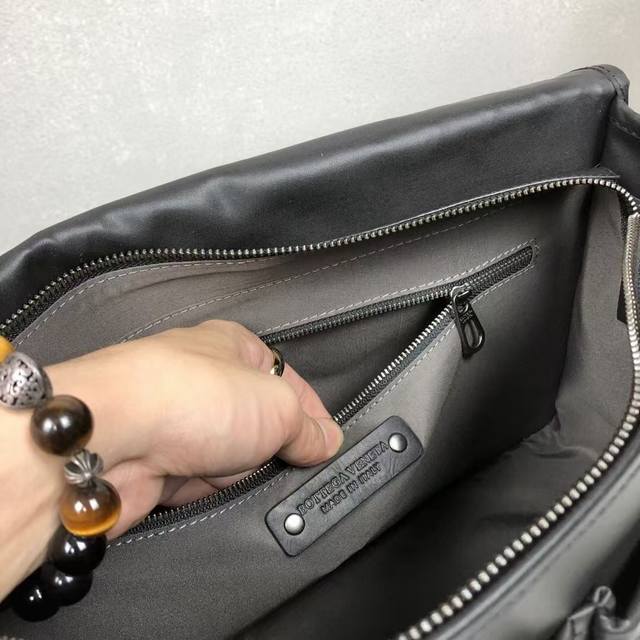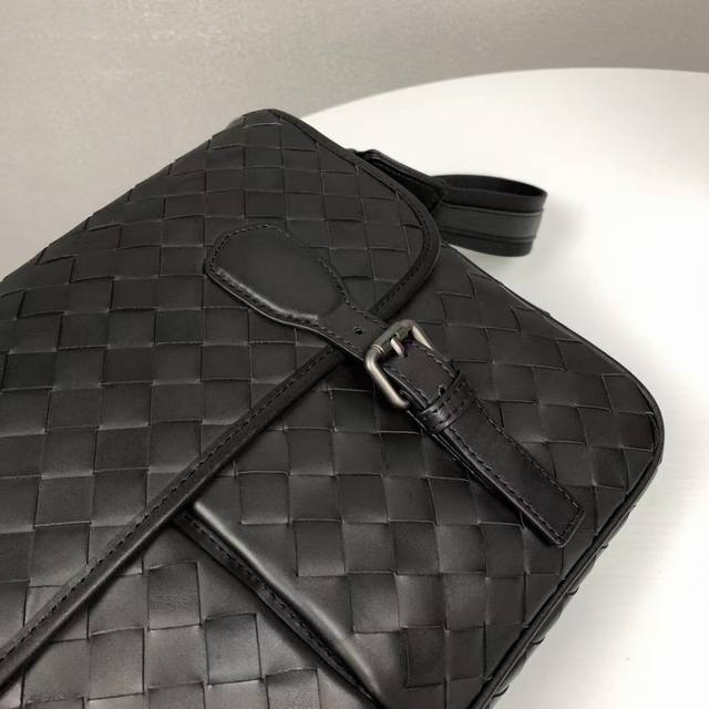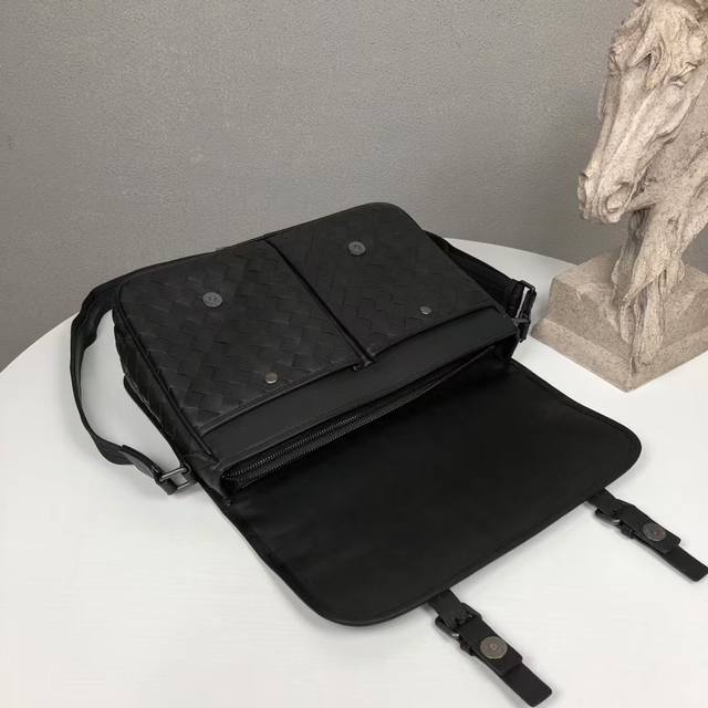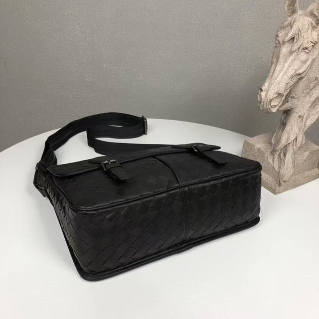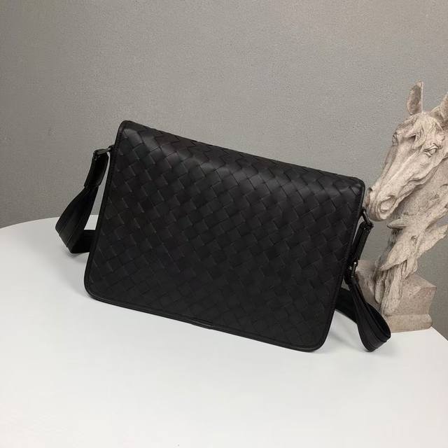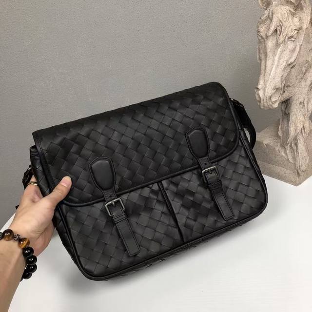 Bv编织邮差包爆款单品,此款邮差包采用纯手工宽条编织制作而成柔软的进口打蜡小牛皮滚边使方形廓形别具魅力,低调实用皮质越用越油亮等特点颜色:黑色,规格:35*22*11Cm。