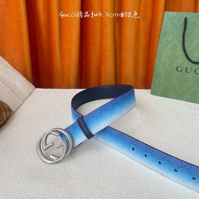 Gucci 新款渐变色蓝色面 搭配同色系深蓝色皮底 精品铜扣 宽4.0Cm 经典永不过时款 潮流大方 时尚百搭