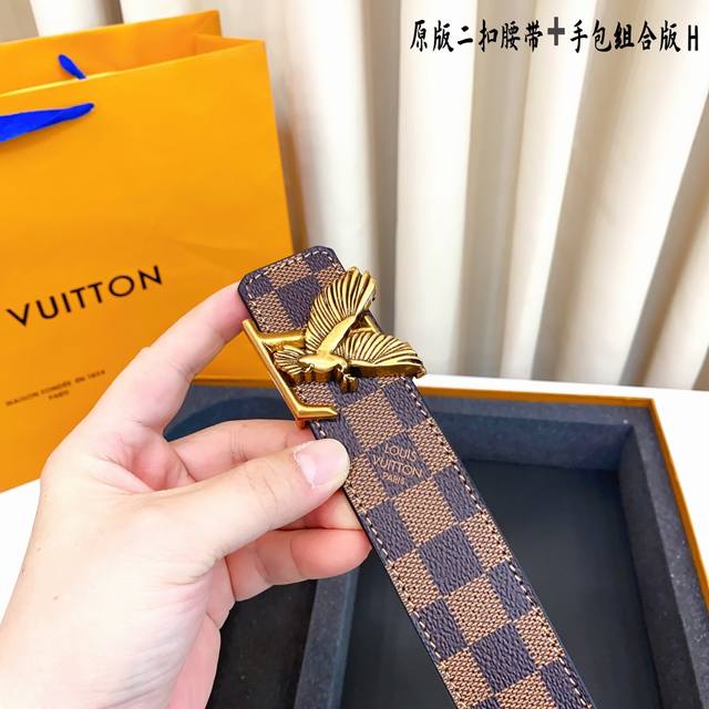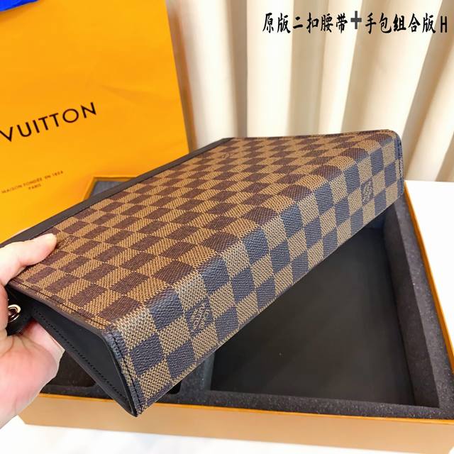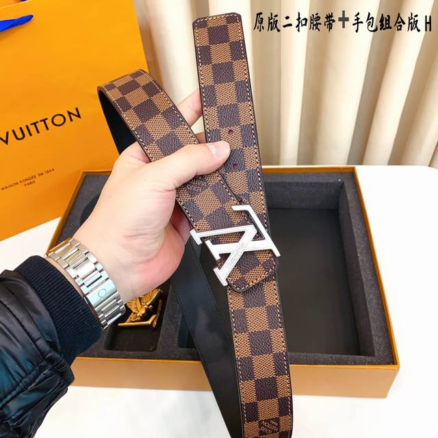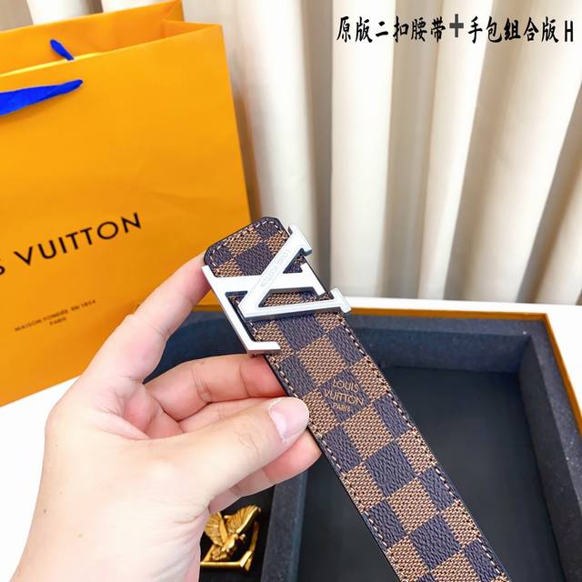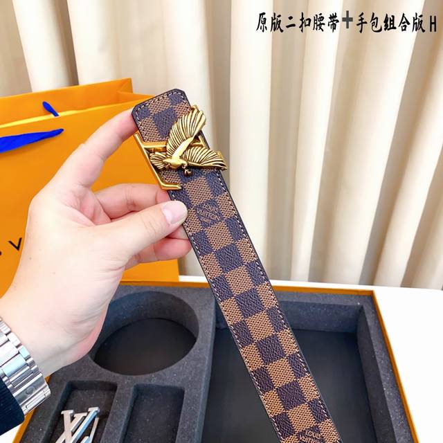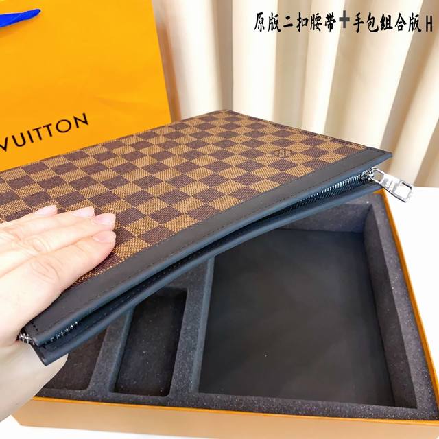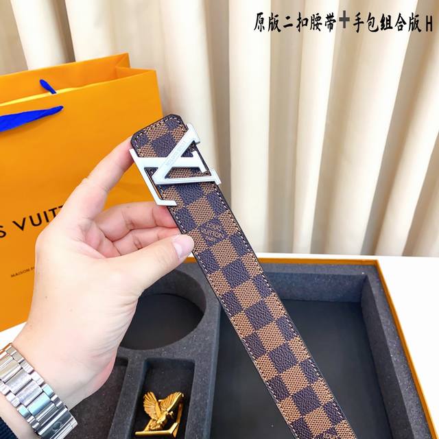 / 腰带双扣手包4件套路易L家 腰带采用原版皮牛皮带身,带宽3.8Cm。2扣头采用原版五金扣头。原版手包原版复刻。尺寸:26*20独家定制4件套高端包装。高端大气送