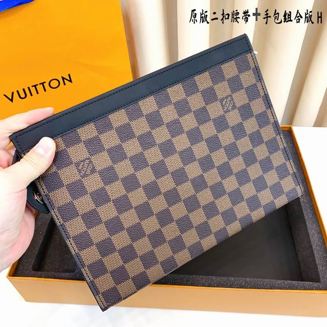 腰带双扣手包4件套路易L家 腰带采用原版皮牛皮带身,带宽3.8Cm。2扣头采用原版五金扣头。原版手包原版复刻。尺寸:26*20独家定制4件套高端包装。高端大气送