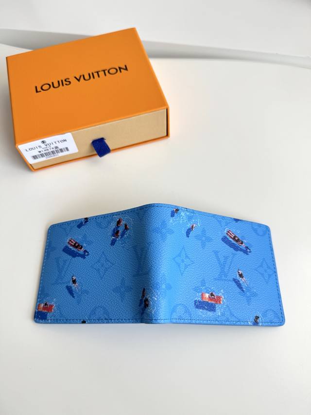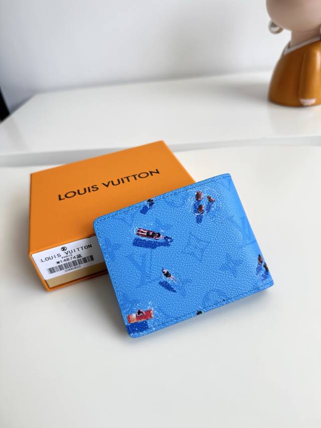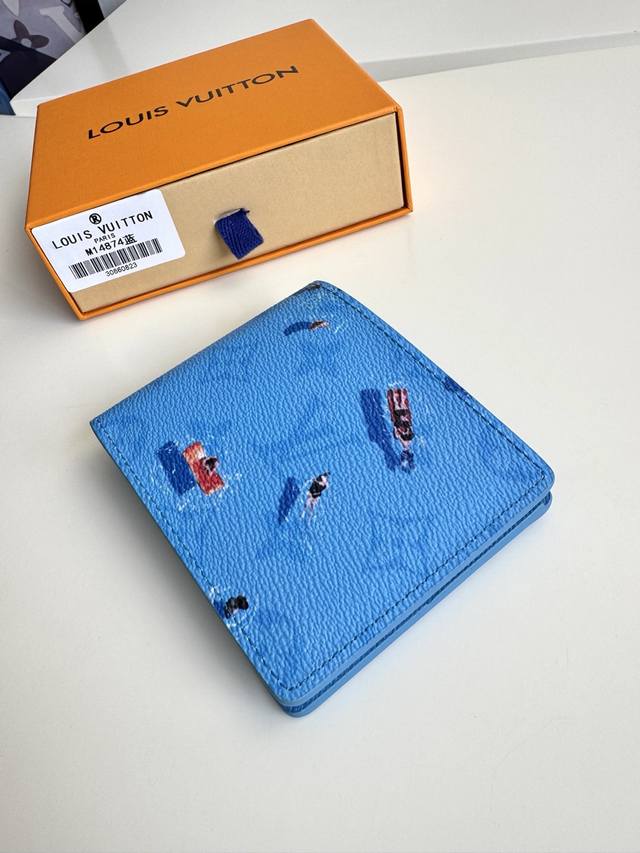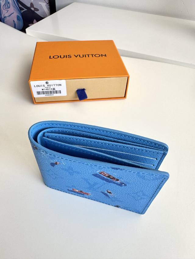 海外原单M14874蓝色独家实拍!本款 Slender 钱夹出自父亲节系列,以 Colored Monogram 帆布呈现浅淡 Monogram 图案,再借袖珍运动场景印花释放身临其境的盎然意趣,成就又一父亲节佳礼。尺寸:11×8.5×2Cm