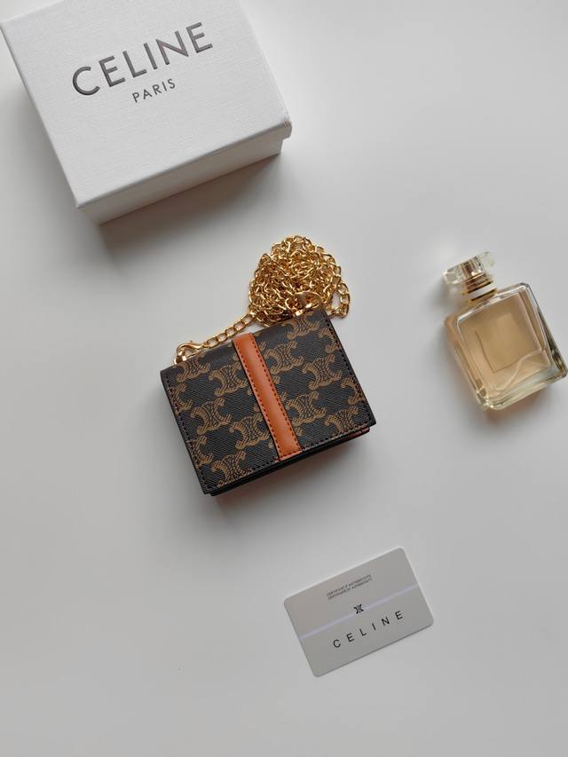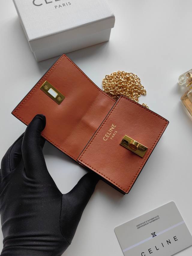 Celine最新链条卡包,Triomphe翻盖链条卡包,可斜挎,经典花纹内配平纹超纤,旋转锁扣开合,1个加厚主隔层,2个内侧卡槽。