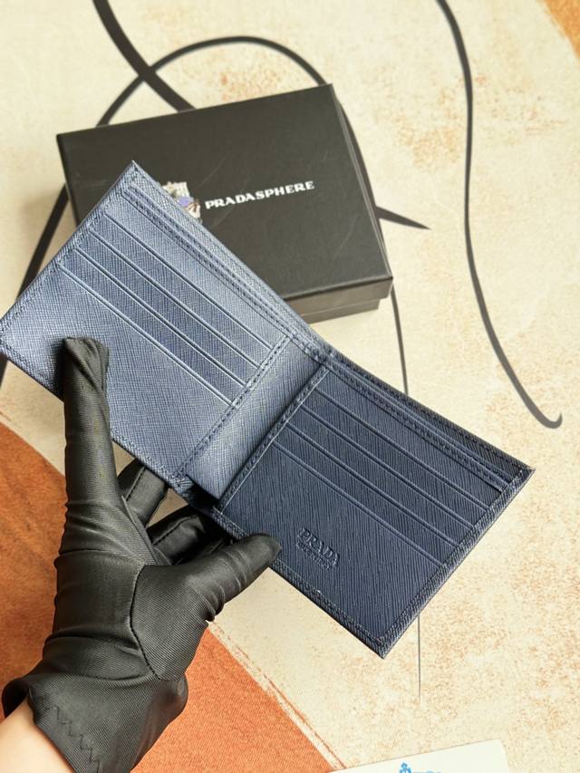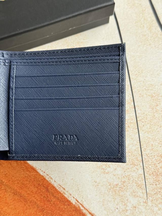 / Prada男士短款钱夹专柜最新款式,官网同步,正品开发,型号2M0513# 颜色 如图 蓝色 Blue牛皮质感极好,螺纹里布 进口白钢五金配件复杂拼色设计,更加